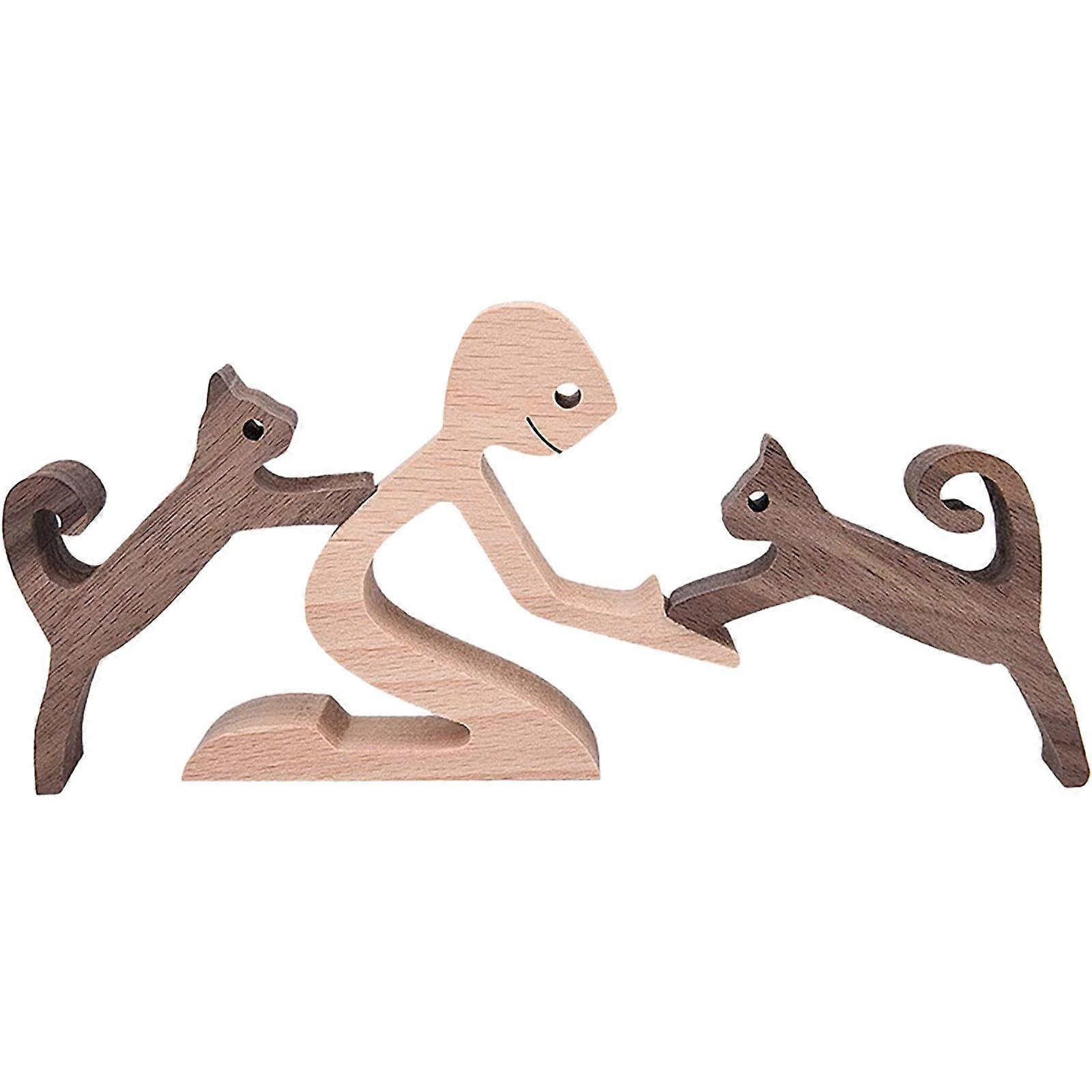 Tkrady Wooden Dog Cat Family Statue, Handmade Wood Decoration, Cute Puppy & Kitty with People Sculpture Ornament for Home, Office