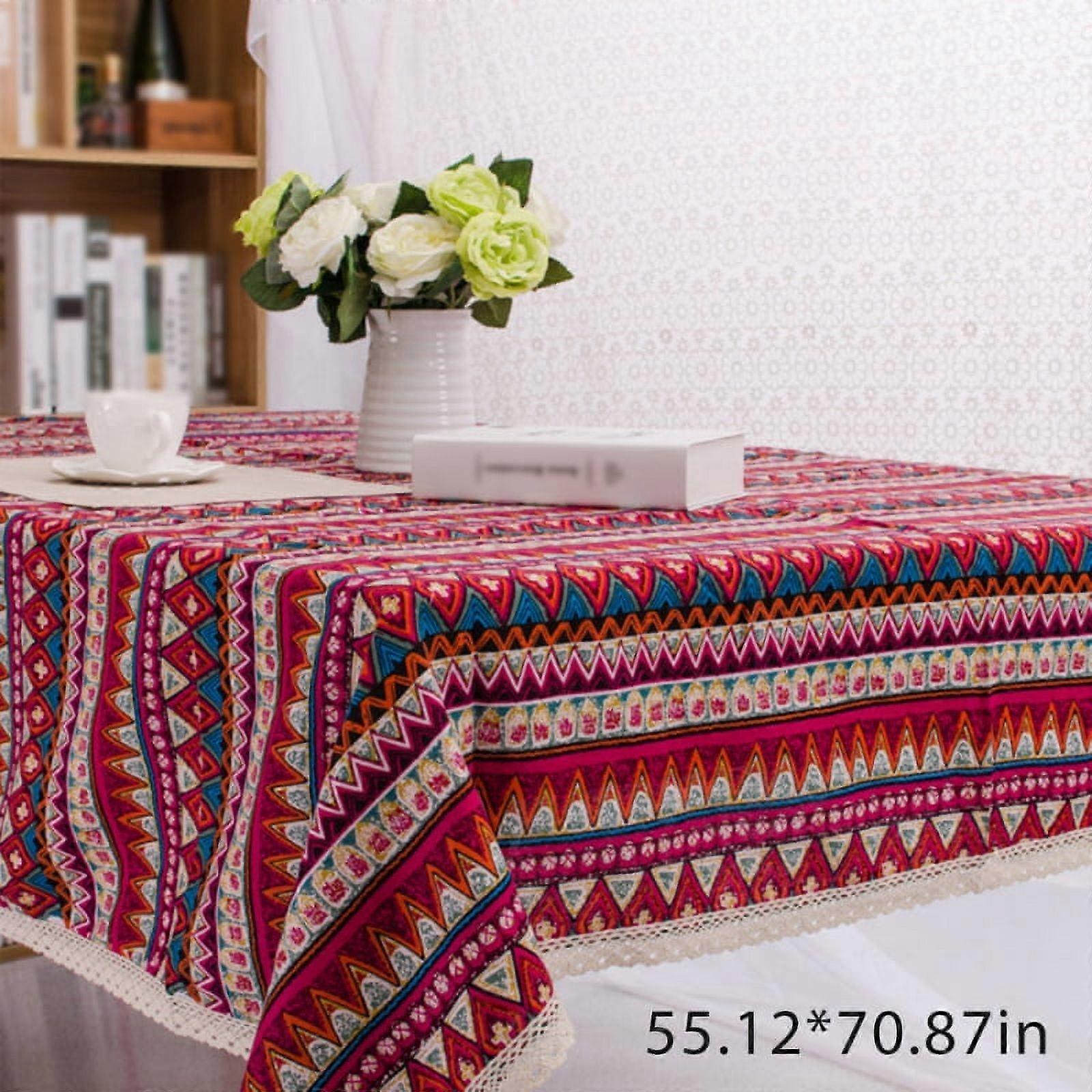 Red Boho Vintage Cotton Linen Tablecloth, Washable Dust-Proof Wrinkle Resistant Rectangular Cover for Indoor Outdoor Dining, Picnic, Restaurant