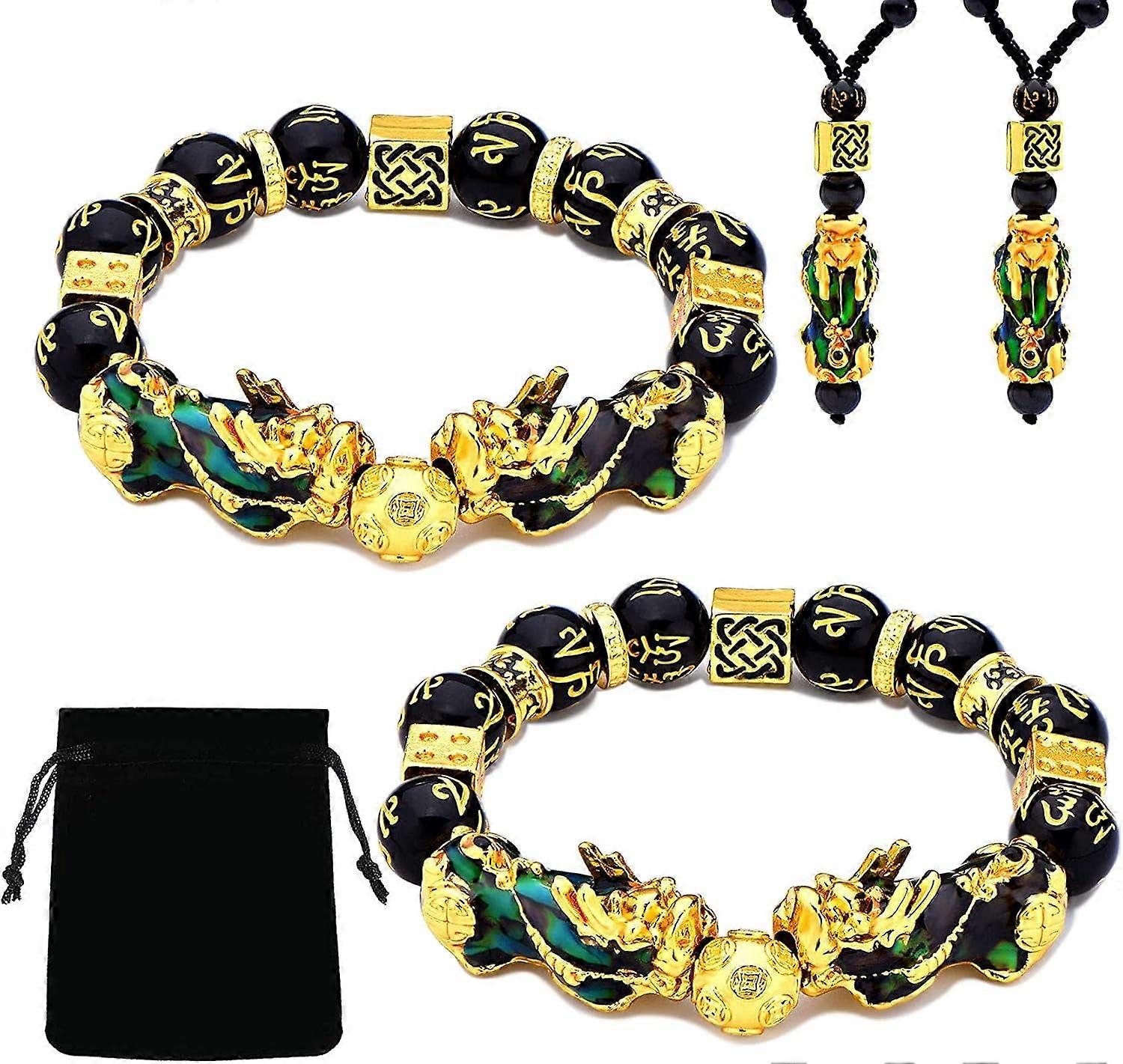 Nutteri Feng Shui Bracelet Necklace Set, 4Pcs Pi Xiu Pi Yao Black Obsidian Wealth Bracelet Good Luck Necklace for Women Men Adjustable Elastic