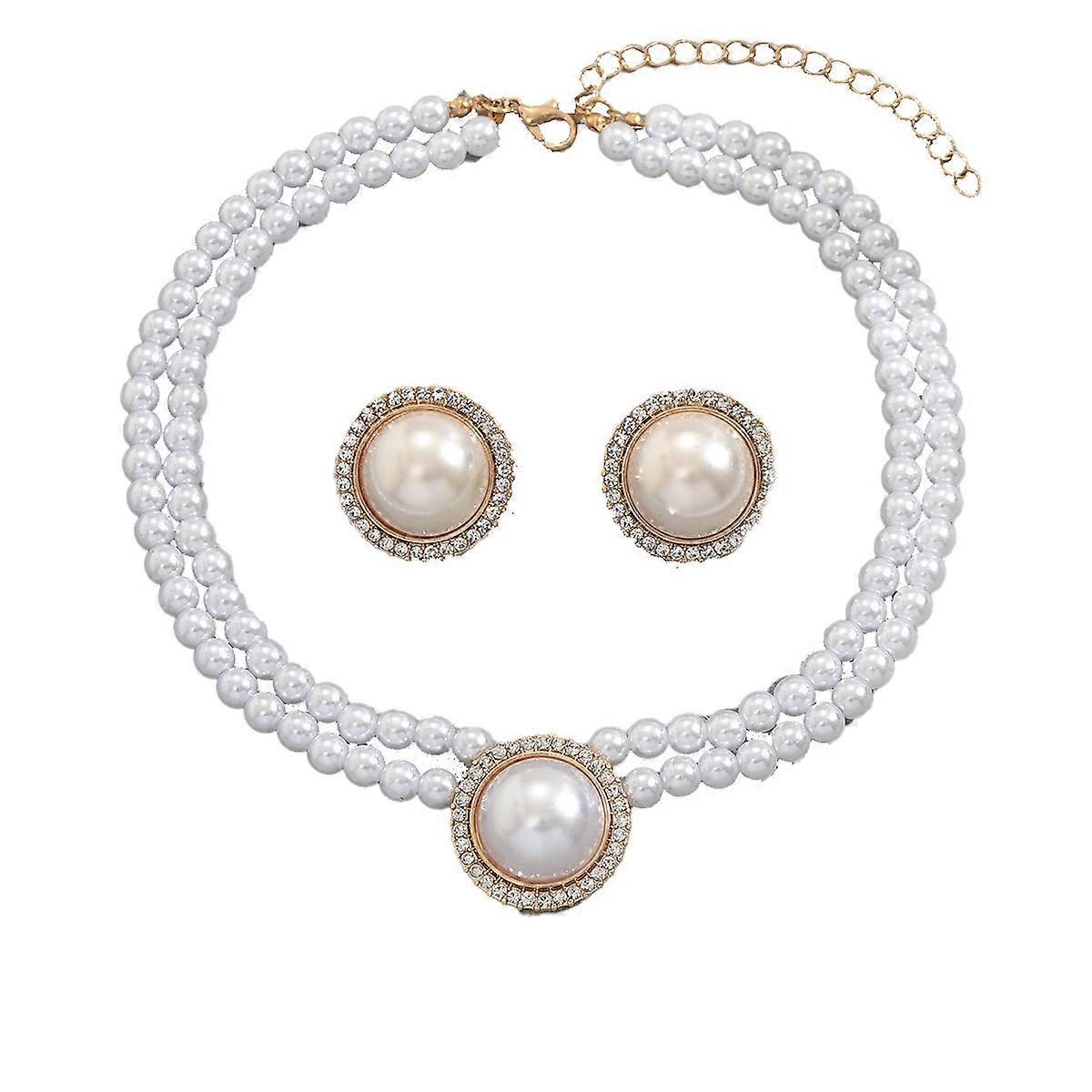 Necklace and Earring Set, Pearl Jewelry with Geometric Diamond Inlaid Pendant, Long Chain for Women