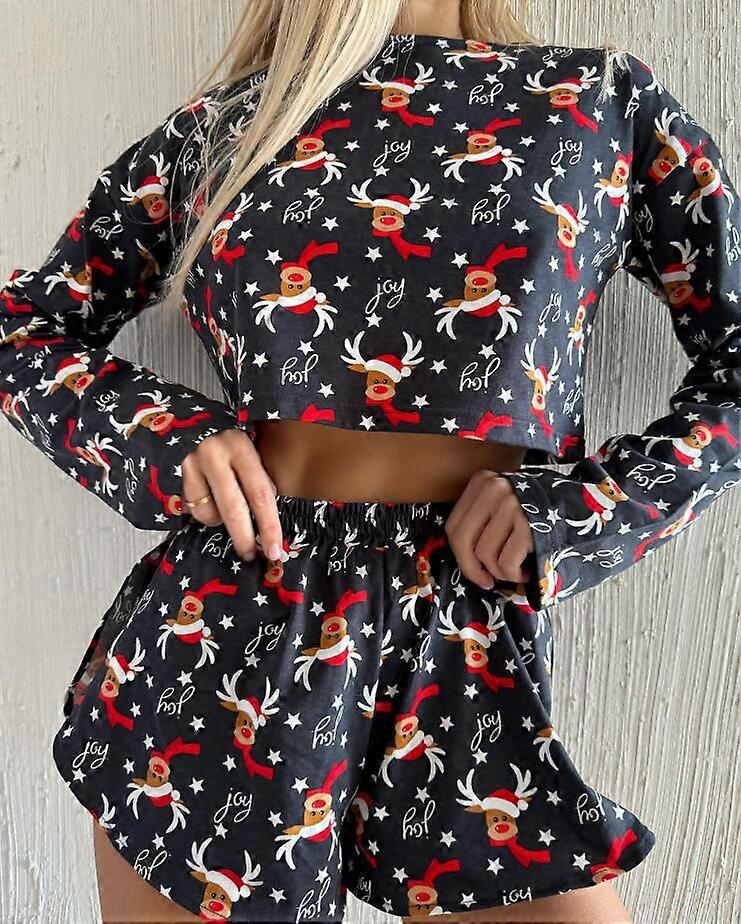 Women's Christmas Reindeer Print Pajama Set Long Sleeve Top Shorts 0.34KGS