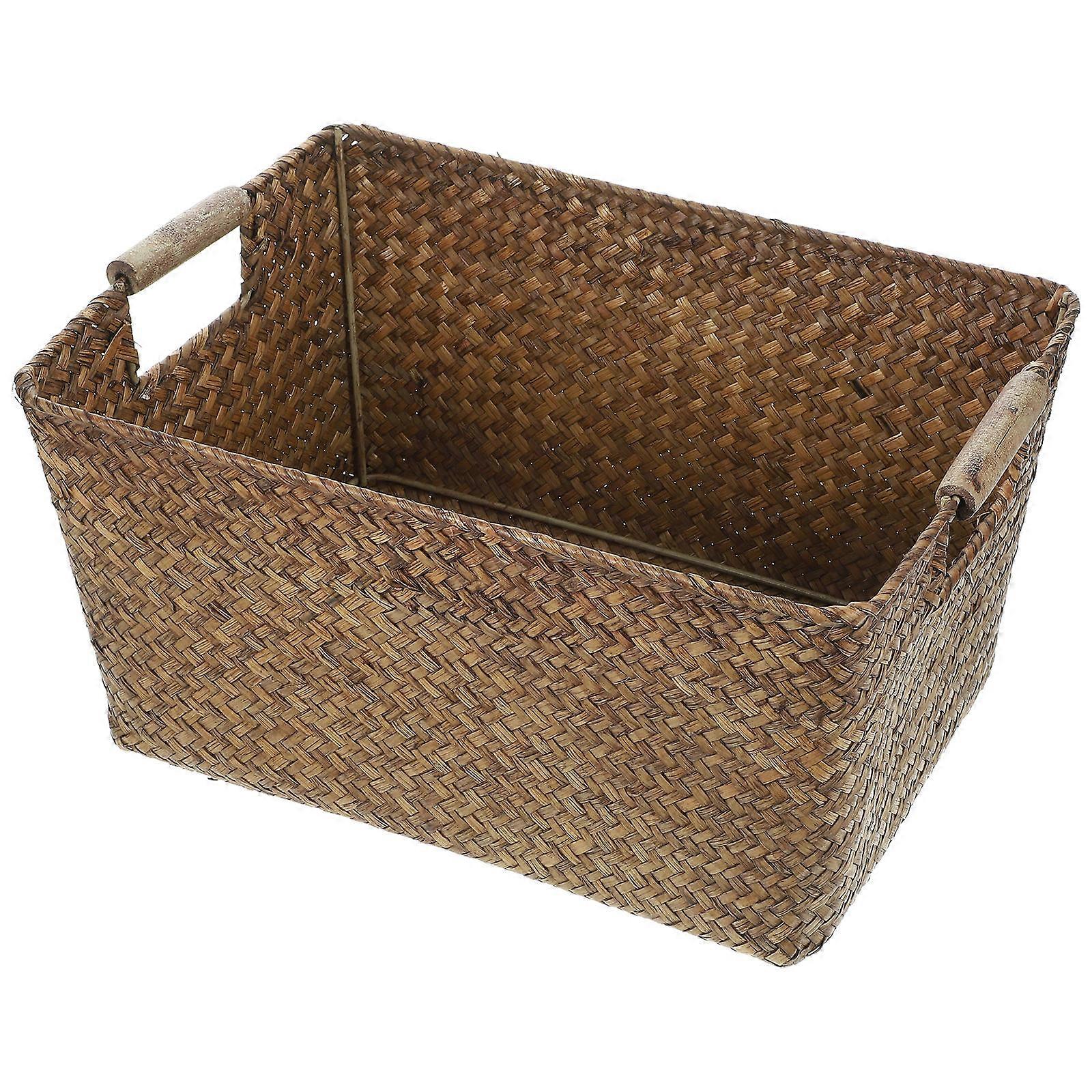 Rectangular Seagrass Basket With Wooden Handle For Bedroom And Study Room Storage 1Set Natural Beauty