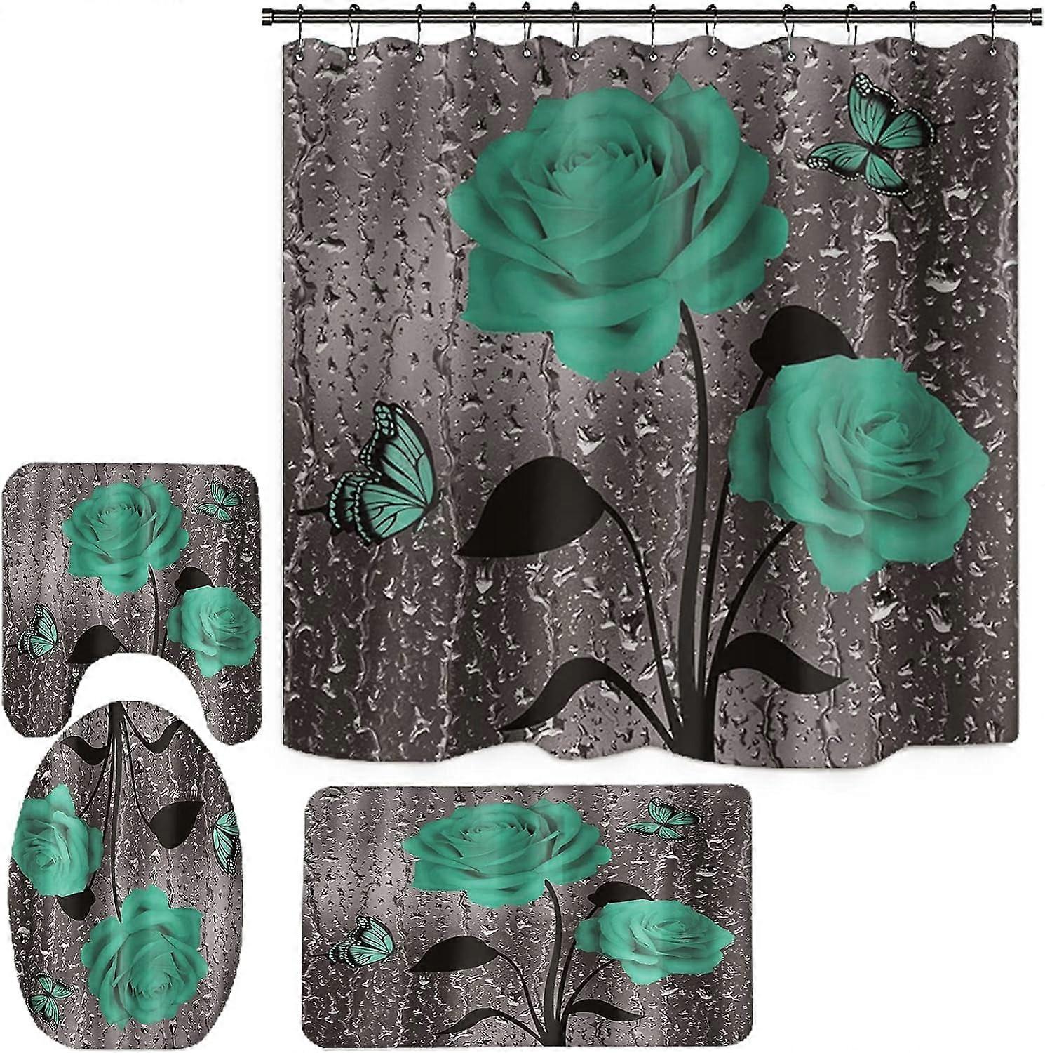 4PC Shower Curtain & Bath Rugs Set, Rustic Blue Rose & Butterfly Design - U Shape Mat, Toilet Cover, Carpet (Green) - Compatible with Bathroom Decor