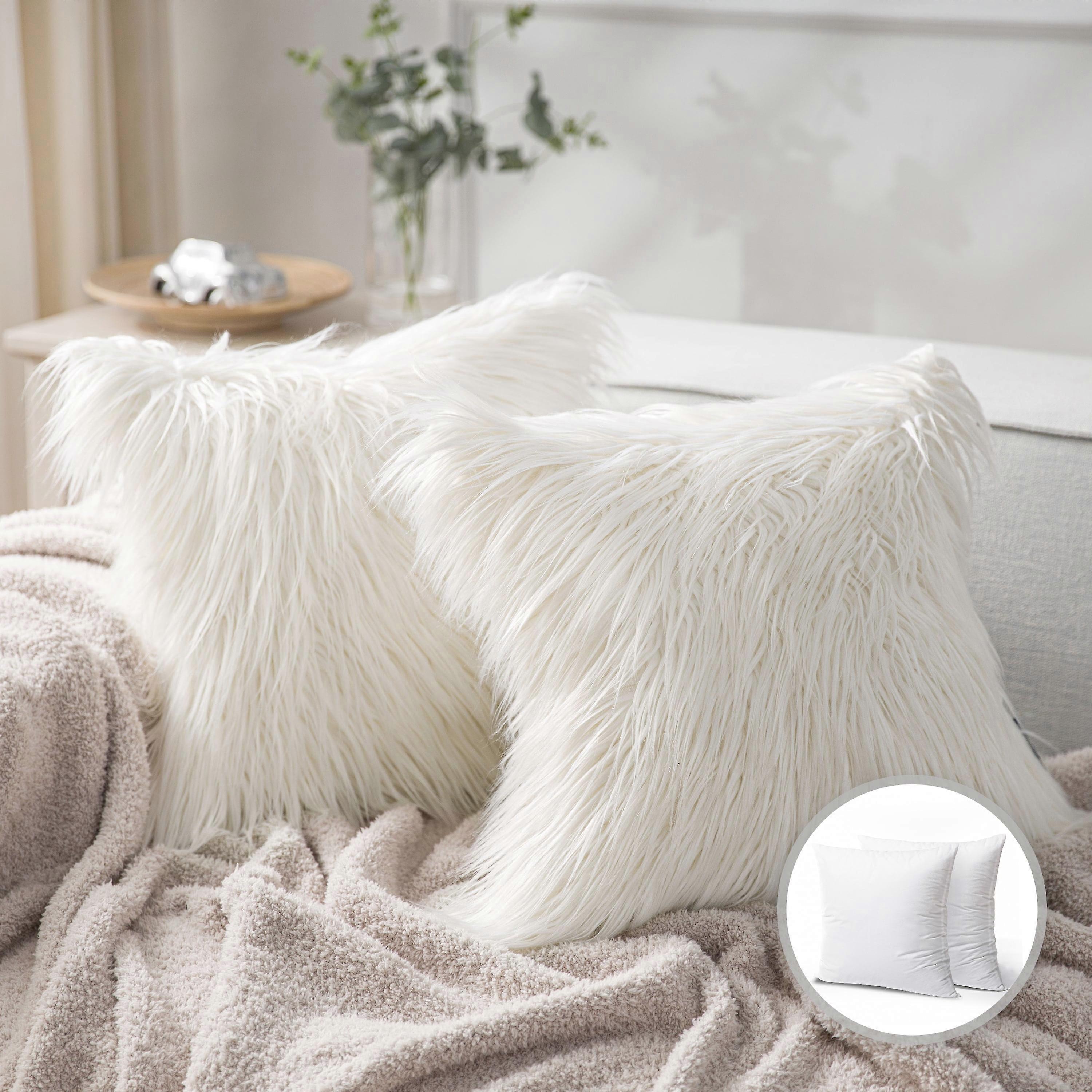 Luxury Mongolian Fluffy Faux Fur Series Square Decorative Throw Pillow Cusion for Couch, 20" x 20", Off White, 2 Pack