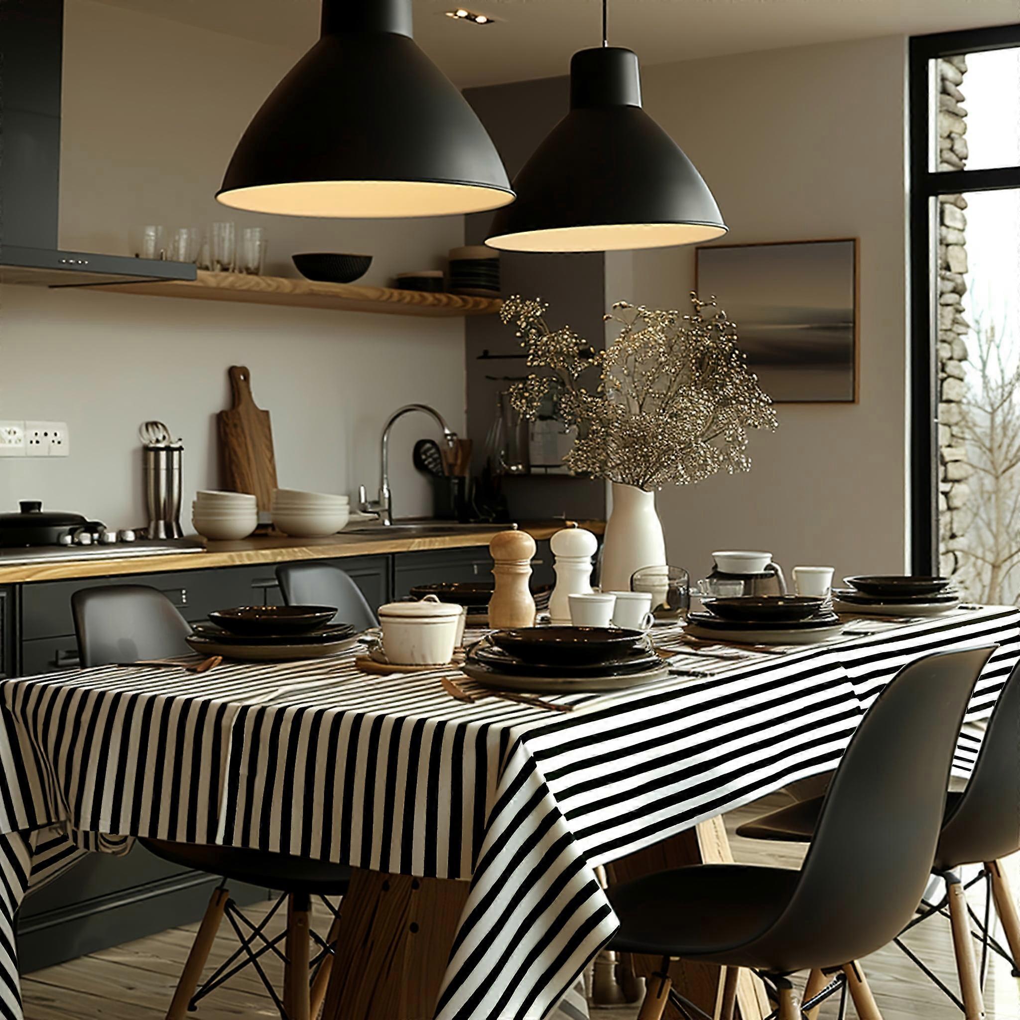 AUMIY Striped Polyester Tablecloth, Rectangle Black & White, Wrinkle Resistant, Durable for Dining, Wedding, Holiday, Thanksgiving - 1pc