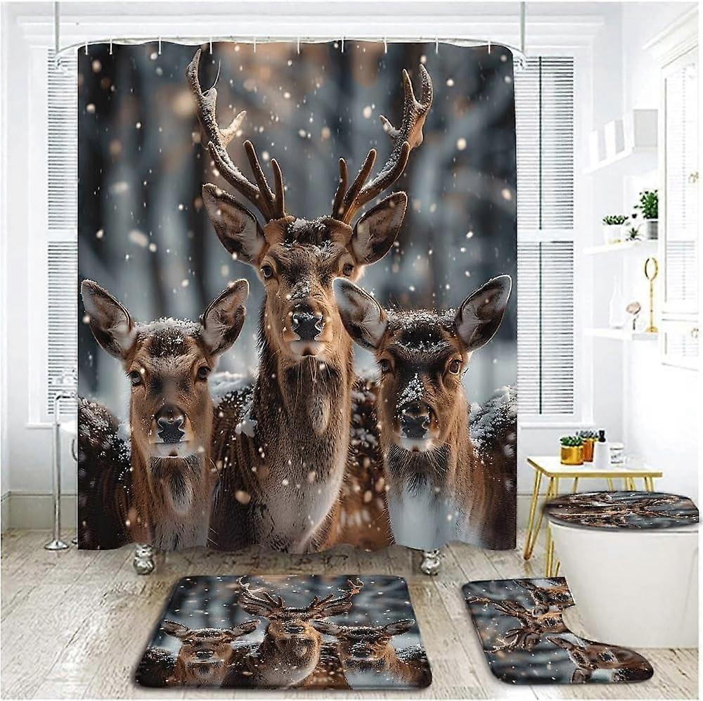 4PC Elk Shower Set w/Rugs & Toilet Cover, Compatible with Christmas Deer, Misty Forest, Rustic Farmhouse Winter Snow Scene Decor
