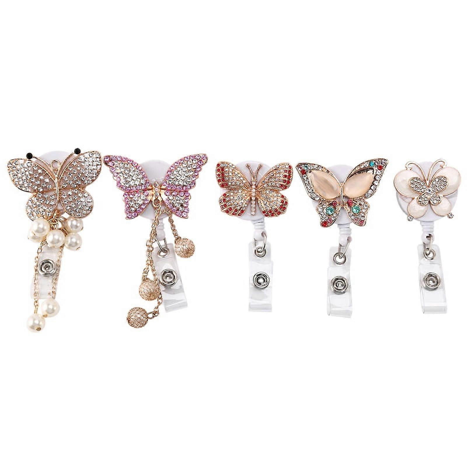5Pcs Retractable Badge Holder Reel, Butterfly Handmade Bling Rhinestone ID Holders with Clip, for Volunteer Nurses