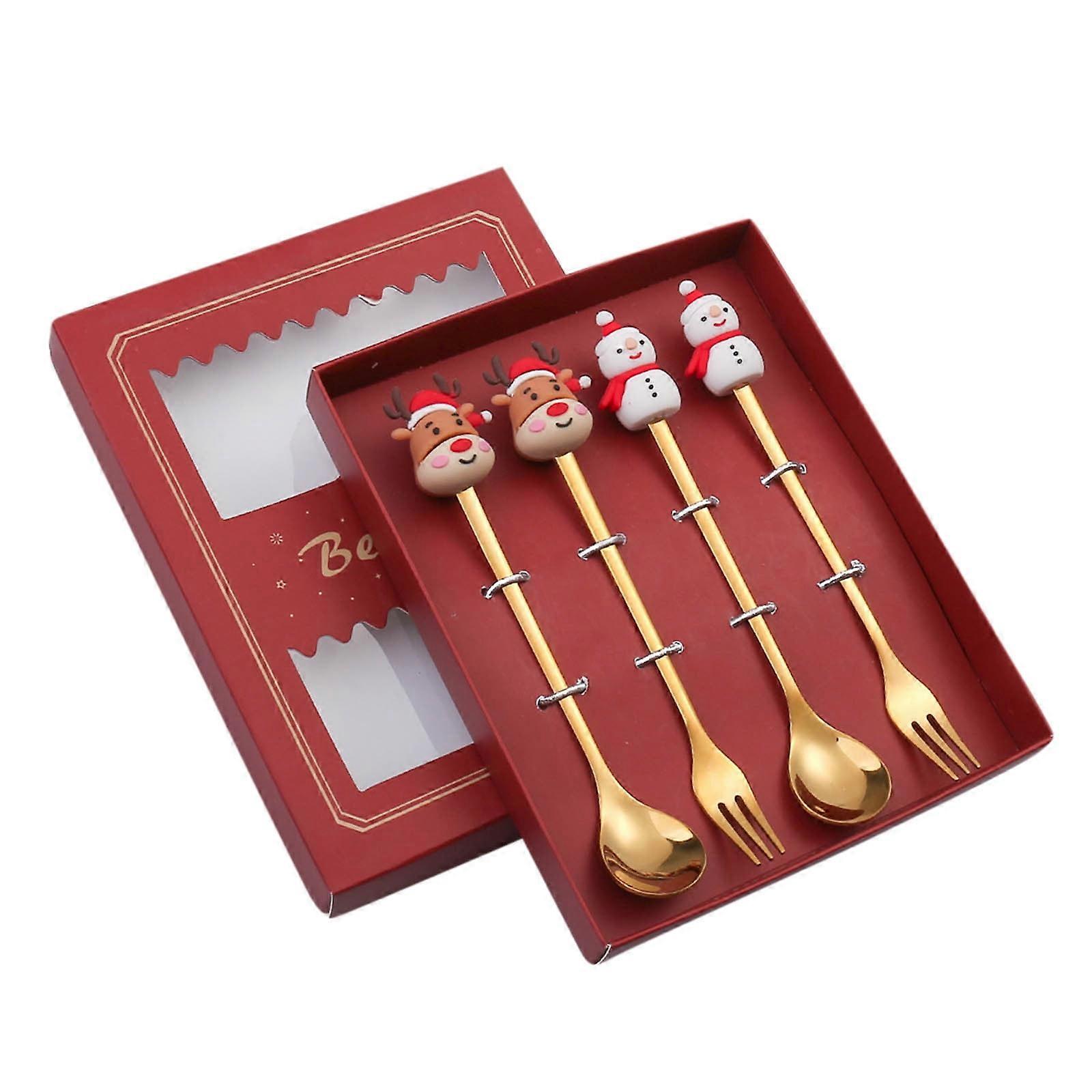 Wovilon 4Pcs Stainless Steel Christmas Spoon Gift Set Dessert Spoon Fork Coffee Spoon Christmas Pendant Spoon Tableware Set