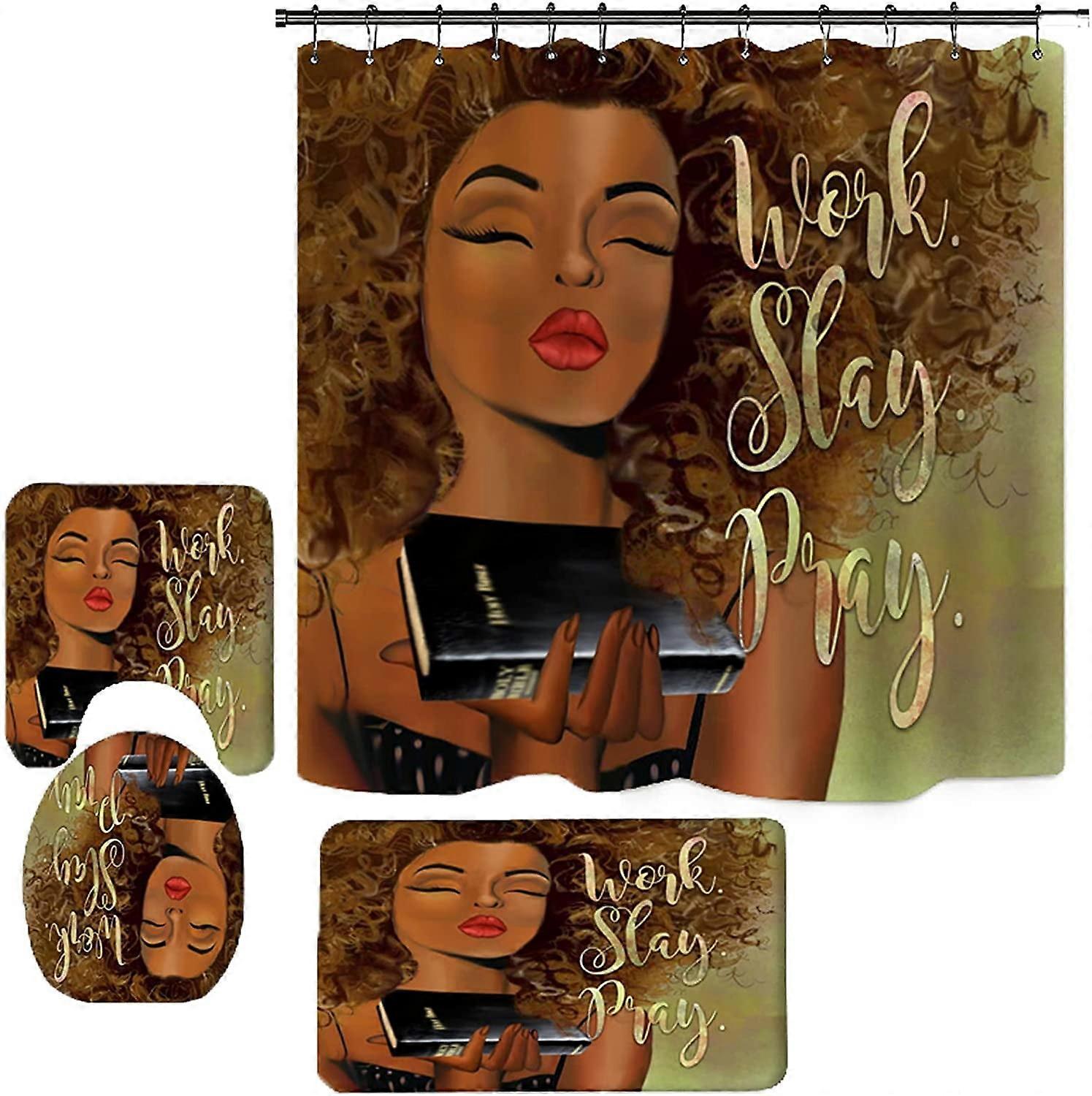 Black Women Shower Curtain Set with Rugs, 4 Pcs Waterproof Bath Mat, Toilet Cover & Hooks, compatible with African American Bathroom Decor