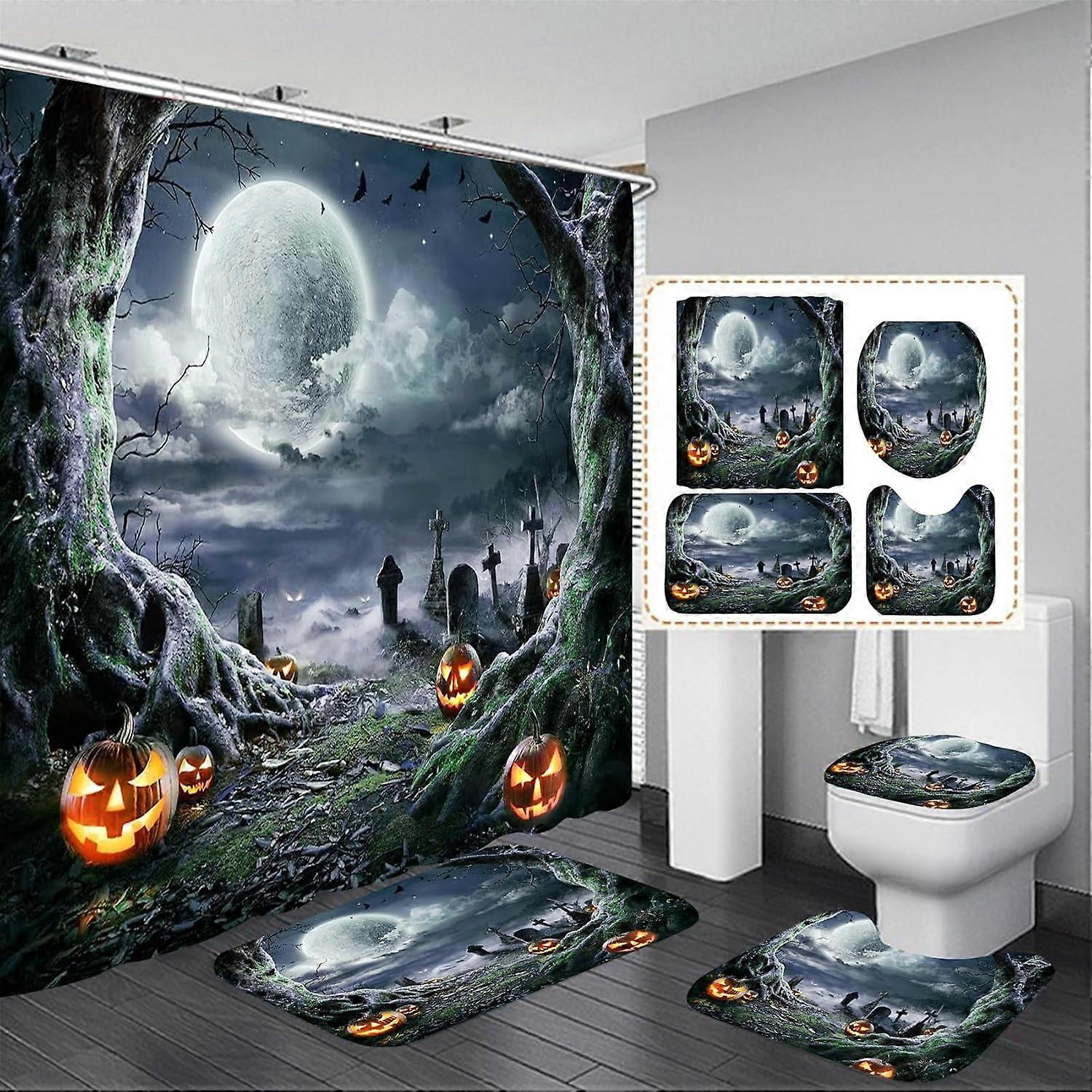 Halloween Shower Curtain Set with Non-Slip Rug, Toilet Cover & Bath Mat, 12 Hooks, Waterproof - Halloween Bathroom Decor