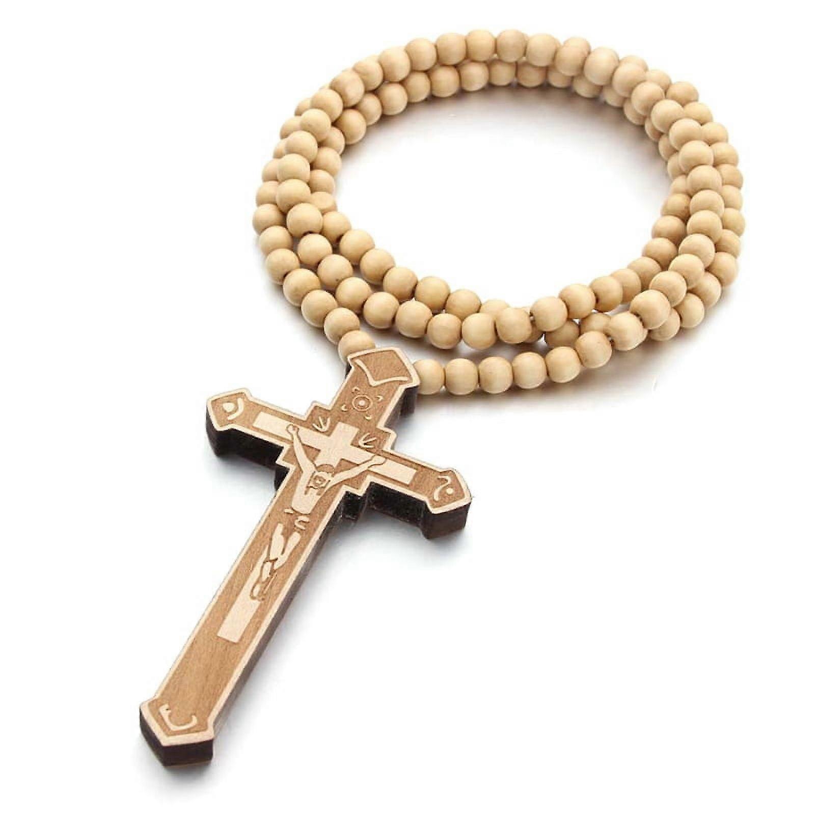 Catholic Cross Necklace with Wooden Beads, Rosary Religious Wear, Jesus Carved Crucifix Pendant Chain, Christian Prayer Jewelry Gift