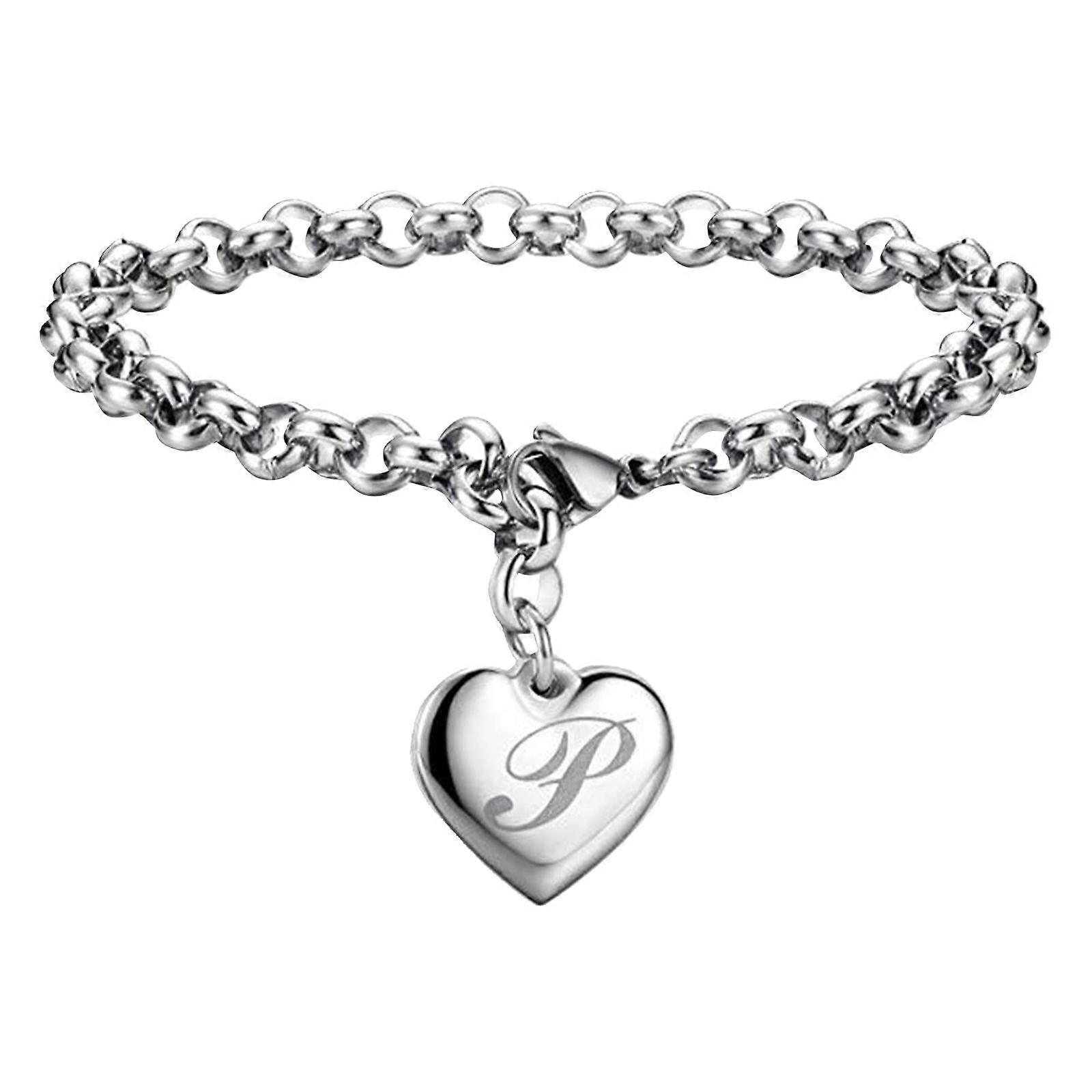 Zttd Fashion Initial Charm Bracelet, Stainless Steel Heart Alphabet Bracelet Jewelry Gift for Teen Girls & Women
