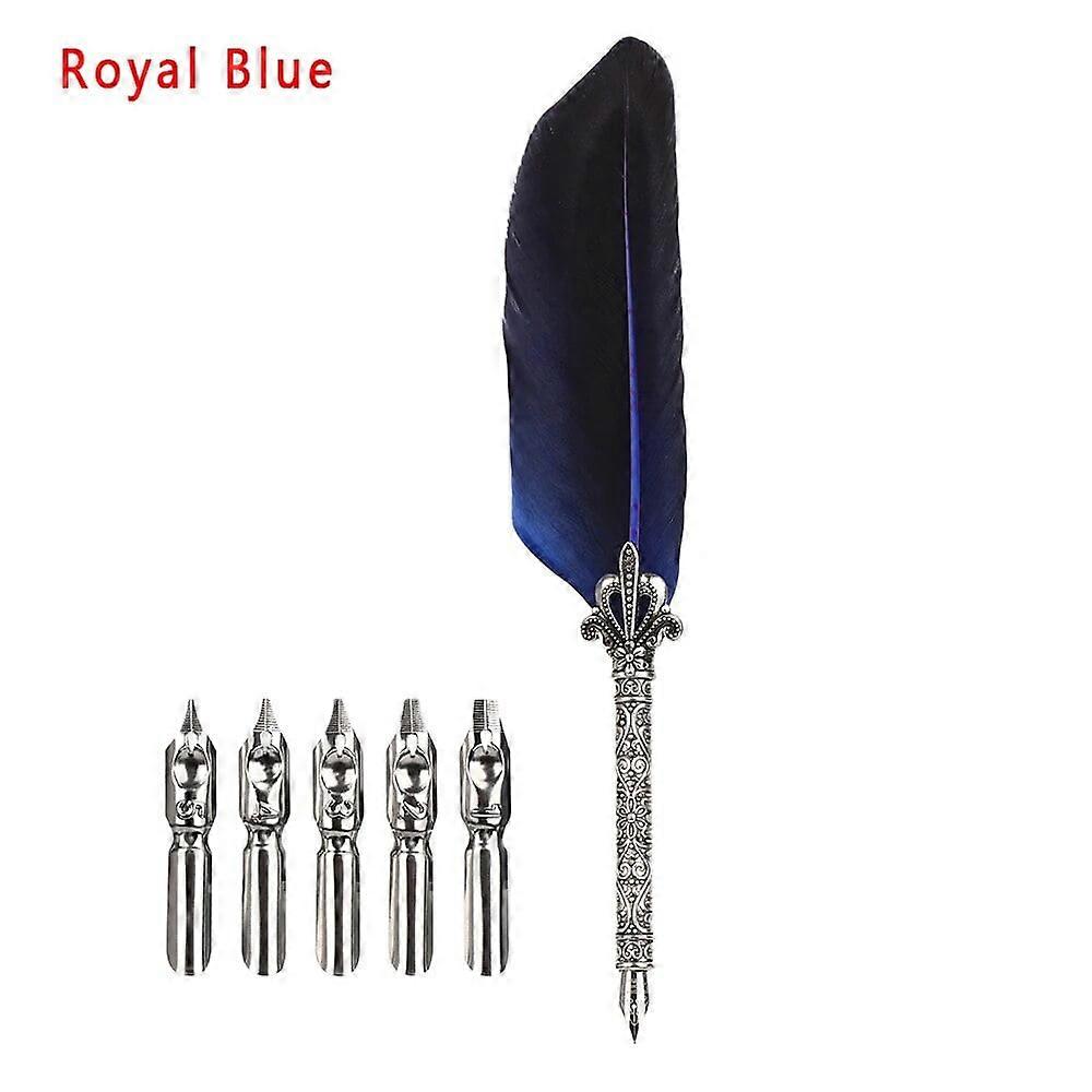 1Set Feather Dip Fountain Pen Chancery Quill Turkey Oblique Pens +5pcs Nib Carved Metal for Fancy Calligraphy Vintage Pen Gift Royal Blue