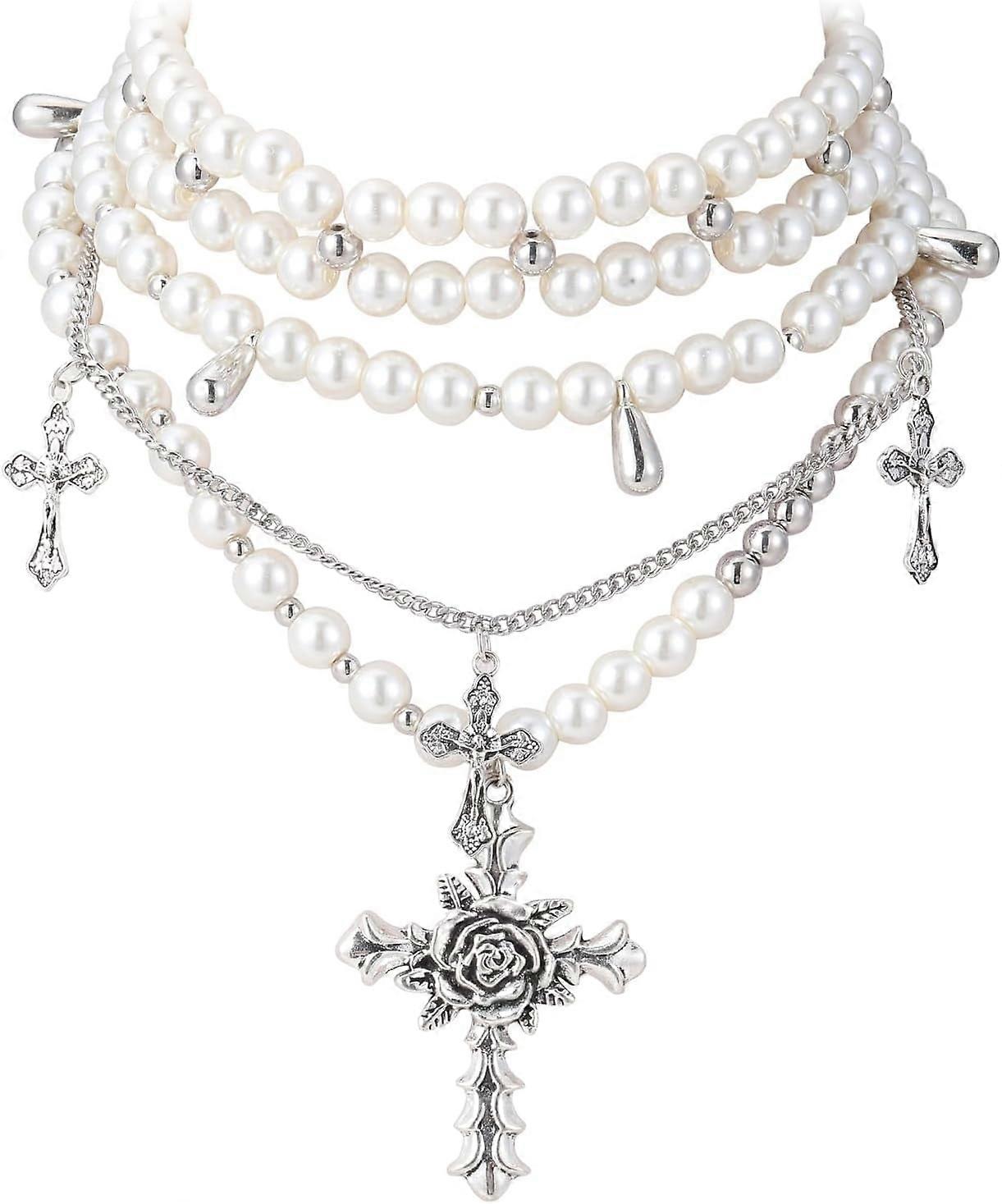 " Layered Pearl Necklace Elevate your style with the Layered Pearl Cross Necklace, a stunning and elegant accessory for women. This statement necklace features a beautiful combination of chunky stacked rhinestones and pearls, creating a gothic yet sophisticated look. Each necklace comes with a 7cm extension chain, ensuring a comfortable fit for all wearers. The timeless elegance of this piece makes it suitable for both casual and formal occasions, adding a touch of glamour to any outfit. The chunky stacked rhinestones and pearls create an eye-catching effect, making it the perfect accessory to showcase your unique and bold sense of style. Whether it's a gift for a loved one or a treat for yourself, this Layered Pearl Cross Necklace is sure to make a lasting impression. (Warning: Applicable only to individuals aged 12 above) " Style: Make a bold statement with this stunning Layered Pearl Cross Necklace, featuring chunky stacked rhinestones for a gothic look. Size: The necklace comes with a 7cm extension chain, ensuring a comfortable and adjustable fit for women and girls of all sizes. Applicable scenarios: The chunky stacked rhinestones and pearls create a glamorous and eye-catching effect, adding a touch of sophistication to any ensemble. Elevate your outfit with the timeless elegance of this statement piece, perfect for both casual and formal occasions. Gift: This statement gothic pearl cross necklace is the perfect accessory to showcase your unique and bold sense of style, making it an ideal gift for fashion-forward individuals. After sales service: If you have any questions about this product, please feel free to contact us at any time.