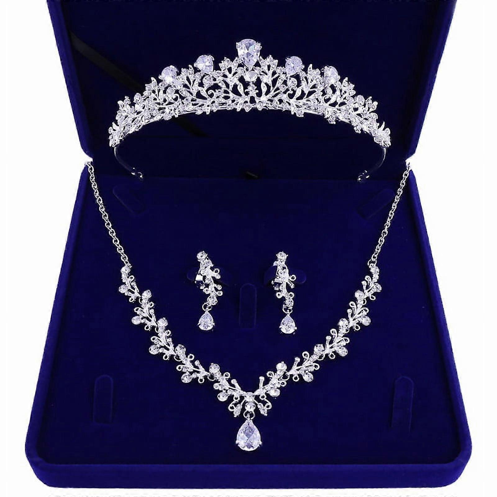 YEUHTLL Bride Necklace Earrings Crown Set Crystal Bridal Wedding Jewelry Silver/Gold