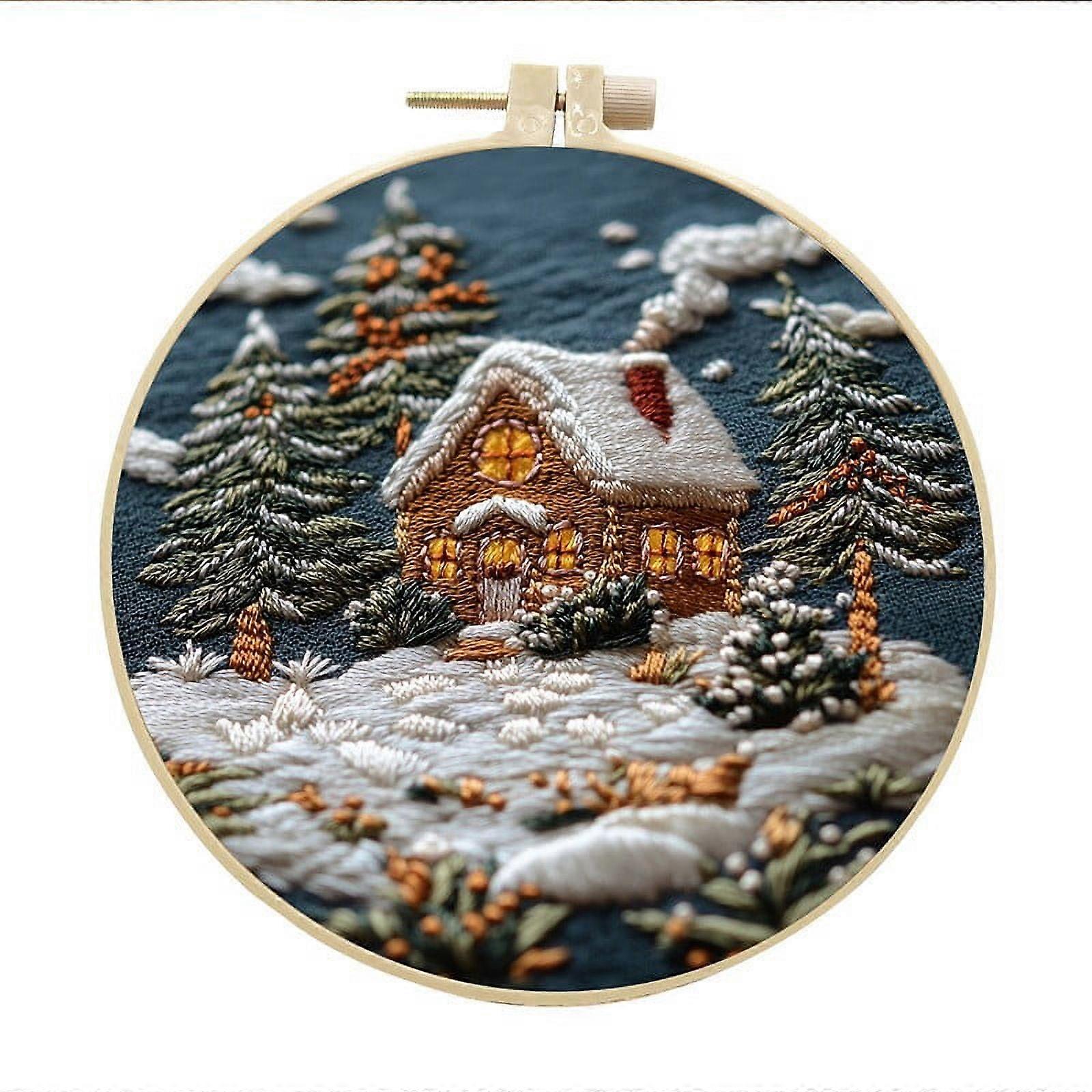 Christmas Embroidery Kit with Hoop, 2024 New Easy Full Kit for Beginners & Adults, Winter Snowy Village Design, Needles Included