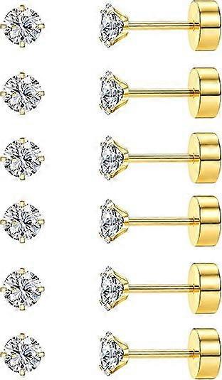Cterwk 6 Pairs 14K Gold Plated Flat Back Earrings Stainless Steel Stud Earrings Set Cubic Zirconia Earring Piercing Jewelry for Women Men, Gold, 3MM