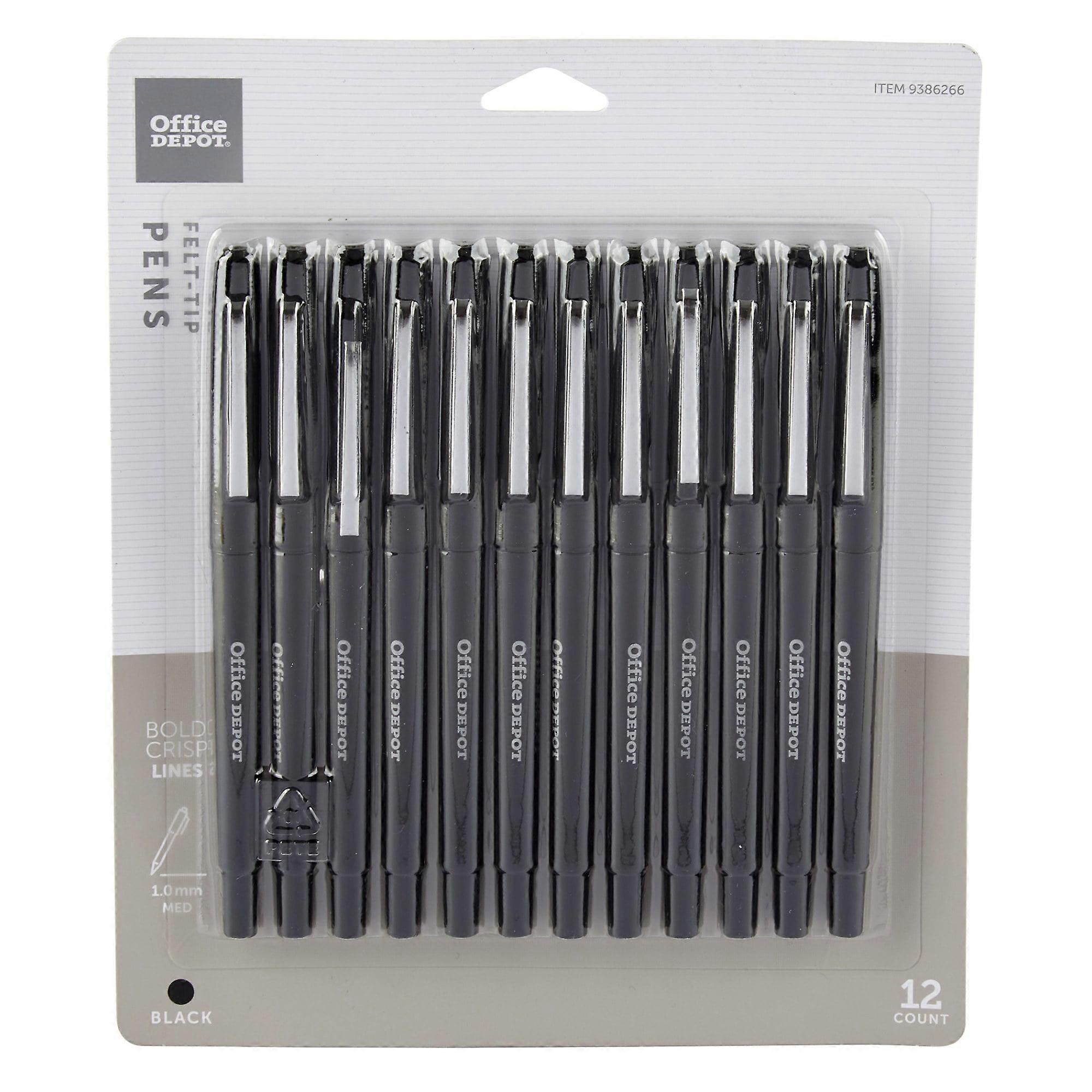 Office Depot® Brand Felt-Tip Porous Pens, Medium Point, 1.0 mm, Black Barrels, Black Ink, Pack Of 12 Pens