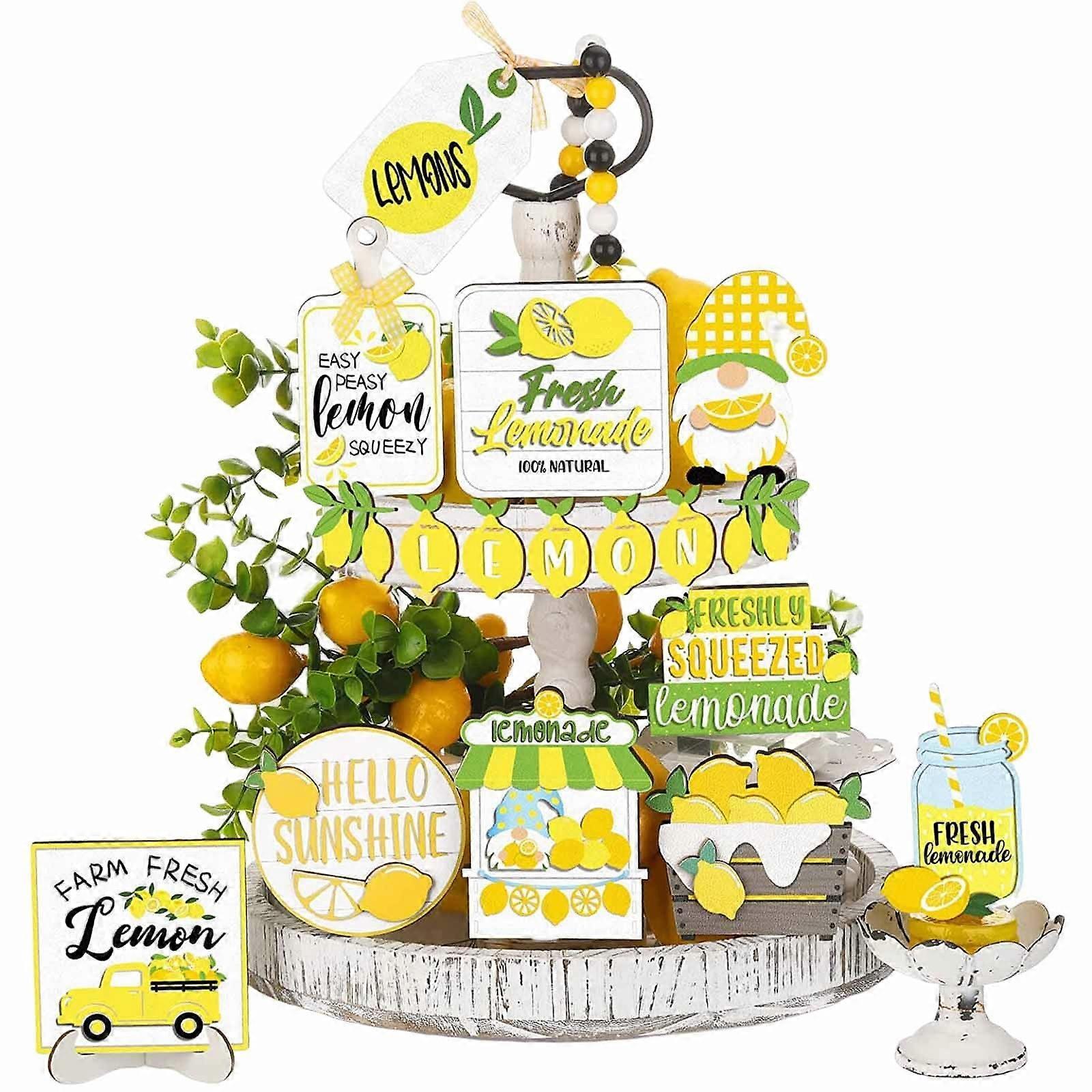ionze Lemon Tiered Tray Decor Set, Farmhouse Wood Sign, Rustic Beach Home Decor for Kitchen Table Shelf (Yellow)