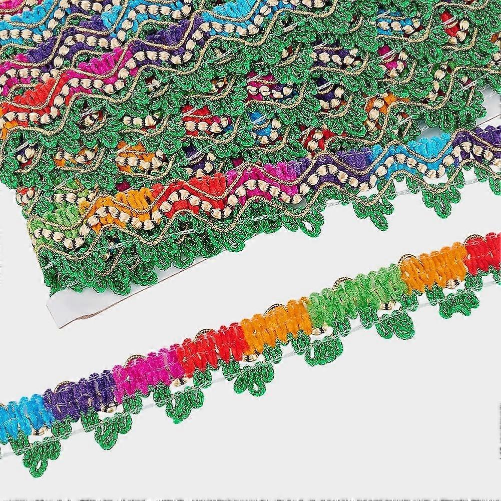 9.8 Yards Gimp Braid Trim 1 inch Wide Shiny Lace Trim with Triangle Flower Patterns Green Metallic Ribbon Sewing Handcraft Gimp Trim Fabric for Sewing DIY Costume Crafting Accessories 【Colorful Design】 This lace is mainly in green color, and the middle weaving part contains red, purple, rose, yellow, green, blue and other colors. The various colors are arranged in a gradient effect, which is both beautiful and unique like a rainbow. 【Package & Size】 You will receive a roll of exquisite colored woven decorative tape, measuring about 9.84 yards/9m long and about 1 inch (25mm) wide, which is enough for you and your family. 【Exquisite Appearance】 This lace is exquisite in style and excellent in workmanship. First, it is closely arranged into an S-shape with colored thread, and the two sides are seamed with fish thread, and the upper part is formed into an S-shape and a V-shape with metallic and gold thread, making the lace more three-dimensional and beautiful; One end is woven into a triangle with green thread, like a flower tassel. 【Durable Material】 Made of high-quality polyester fiber, it is of high quality and very durable. It is tightly woven and not easy to tear. Elegant and beautiful design and exquisite craftsmanship make your handicrafts more charming. 【Widely Use】 It is applicable to various clothing sewing decoration, curtain or sliding sleeve decoration, home decoration, interior decoration, shop decoration and other manual DIY accessories.