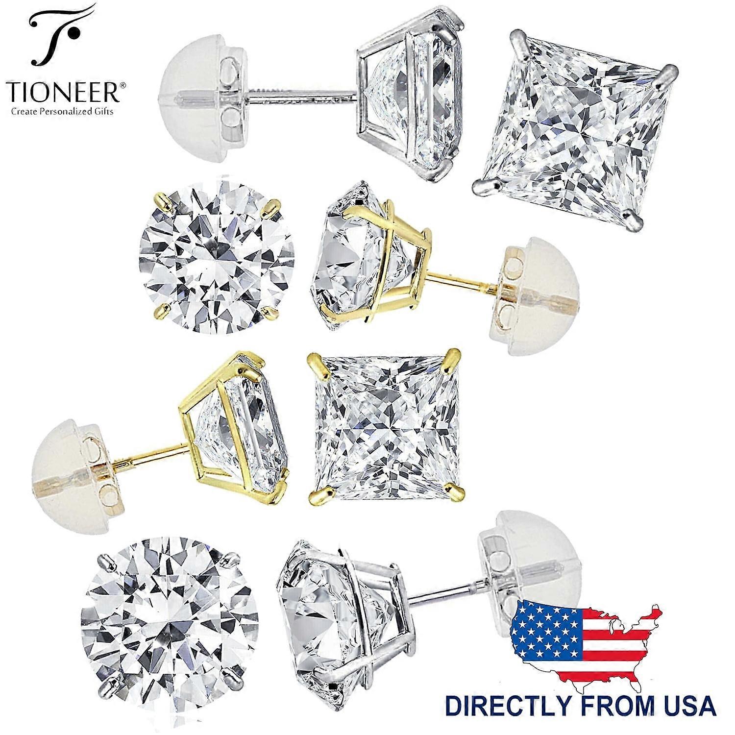 Tioneer 14K White or Yellow Gold Princess Solitaire Cut Round or Square Cubic Zirconia Silicon Push Back Ear Stud Earrings 2-8mm