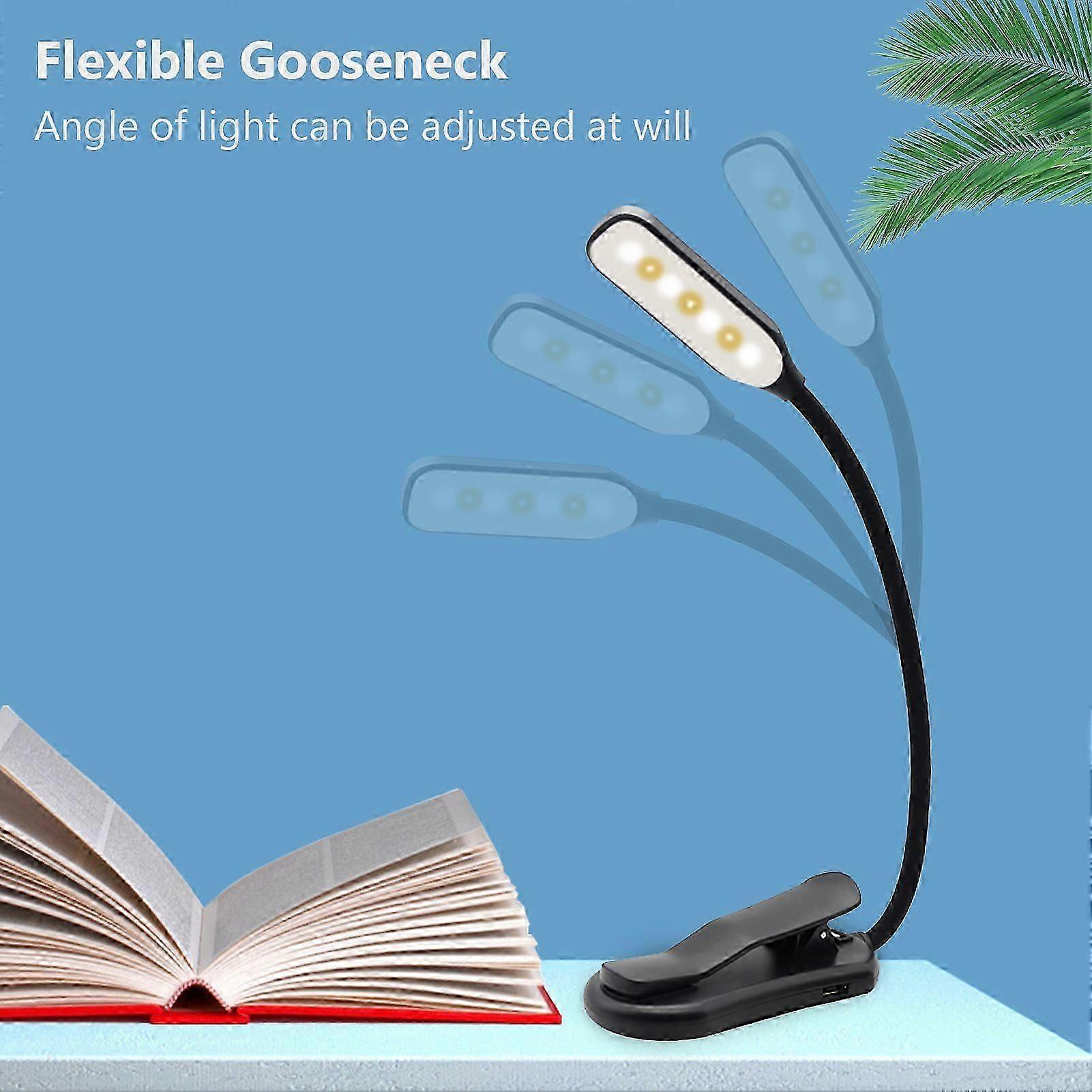 Feature:1. 3 Levels Dimming \u0026 Night Light Mode: Easy to use, touching the switch, 3-level dimming, with the darkest light, medium light, and the brightest light. It meets your needs for lighting. You can use the night light when you rest.2. USB Charging: The darkest light source can work for 10 hours, the medium-light source can work for 6 hours and the brightest light source can work for 5 hours.3. Small\u0026Clip Design\u0026Flexible Gooseneck: Clip design can be clipped on the desk and book, the angle of light can be adjusted at will, the light beam can be accurately aligned where needed.4. Non-flicker Screen \u0026eye conservation LED lamp beads: Uniform and soft illumination, close to natural light, almost no ghosting, long-term use won\u0027t hurt the eyes.5. Warranty: If there are any problems, please contact our store in time. We will give you a satisfactory solution.Specification:Features:3 Levels Dimming & Night Light Mode: Easy to use, touching the switch, 3-level dimming, with the darkest light, medium light, and the brightest light. It meets your needs for lighting. You can use the night light when you rest.USB Charging: The darkest light source can work for 10 hours, the medium-light source can work for 6 hours and the brightest light source can work for 5 hours.Small&Clip Design&Flexible Gooseneck: Clip design can be clipped on the desk and book, the angle of light can be adjusted at will, the light beam can be accurately aligned where needed.Non-flicker Screen &eye conservation LED lamp beads: Uniform and soft illumination, close to natural light, almost no ghosting, long-term use won't hurt the eyes.Warranty: If there are any problems, please contact our store in time. We will give you a satisfactory solution.Specifications:Item: BooklightMain material: PC and ABSMain color: BlackBattery: 600mAh batteryWorking time: 5-10hLamp beads: 7 pcsPower: 5WColor temperature: 5500K-6000KOutput: DC 5V/1AHow to use: Touching switch 3 levels dimmingProduct size: 30*4.3*2.8cmProduct weight: 61gNote:*There could be some deviations due to manual measurement or slight color difference owing to photographing condition. Thank you for your understanding.Package information:Package Weight: 87g Package size: 11.6*7.1*5.3cmPackage list:1* Book light1* USB charging cable1* English manualPackage List:1* Book light1* USB charging cable1* English manual