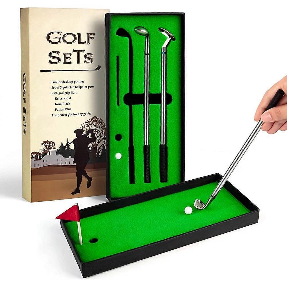 Golf Pen Set, Mini Desktop Golf Ball Pen Gift Set: Description: The mini-golf pen set is made of high-level aluminum alloy, zinc alloy, rubber, foam, and flock ensure the quality and durability of it. Our Desktop Golf set is packaged beautifully to make it the perfect gift. The Package Included: 3 x Golf Ball Point Pens(putters), 2 x Golf Balls, 1 x Flag, 1 x Green Putting Fun for desktop putting or spending time with your colleague, friends, and family. Portable and lightweight, try a Hole in One with your colleague, friends, and family at any time and anywhere. Ballpoint pen set with 3 colors ballpoint pens,3 colors refill ink pen can meet your daily write and work requirements. Ideal gift for golfer and the perfect choice for party, event, and club awards. Fun for desktop putting or spending time during the free hours at home, at work, etc. Simply pull off the rubber grip to reveal the pen nib; Comes with two golf balls, a flag, and the gift box serving as putting greens for you to enjoy mini-golf play. The mini-golf pen set is made of high-level aluminum alloy, zinc alloy, rubber, foam and flock to ensure the quality and durability of it.