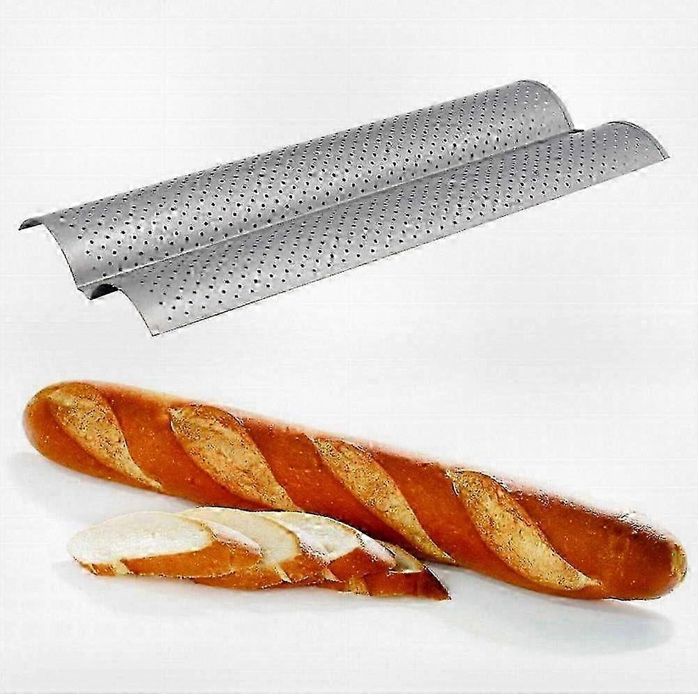 Heat and baking resistant, oven and dishwasher safe. The perforated surface allows moisture to escape for crisp bread. The two-wave design bakes two loaves at once, perfect for homemade French bread. Features a PTFE non-stick coating for easy release and cleaning. Made of high-quality carbon steel with smooth, odorless, and eco-friendly surfaces. Product details: - Material: Stainless steel - Size: 38 x 16.2 x 2.4 cm - Weight: 245 g - Capacity: 2 loaves Package includes: 1 x Baguette pan