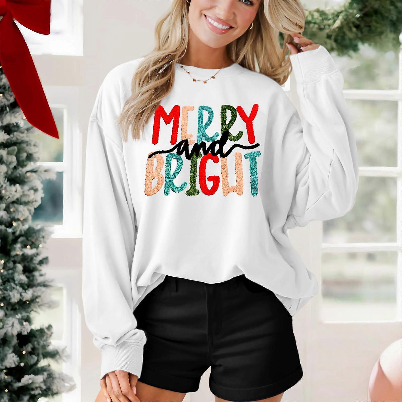 Women's Christmas Sweatshirt Cheerful Embroidered Sweater Crew Neck Wool Linen Warm Winter Wear Yellow XL