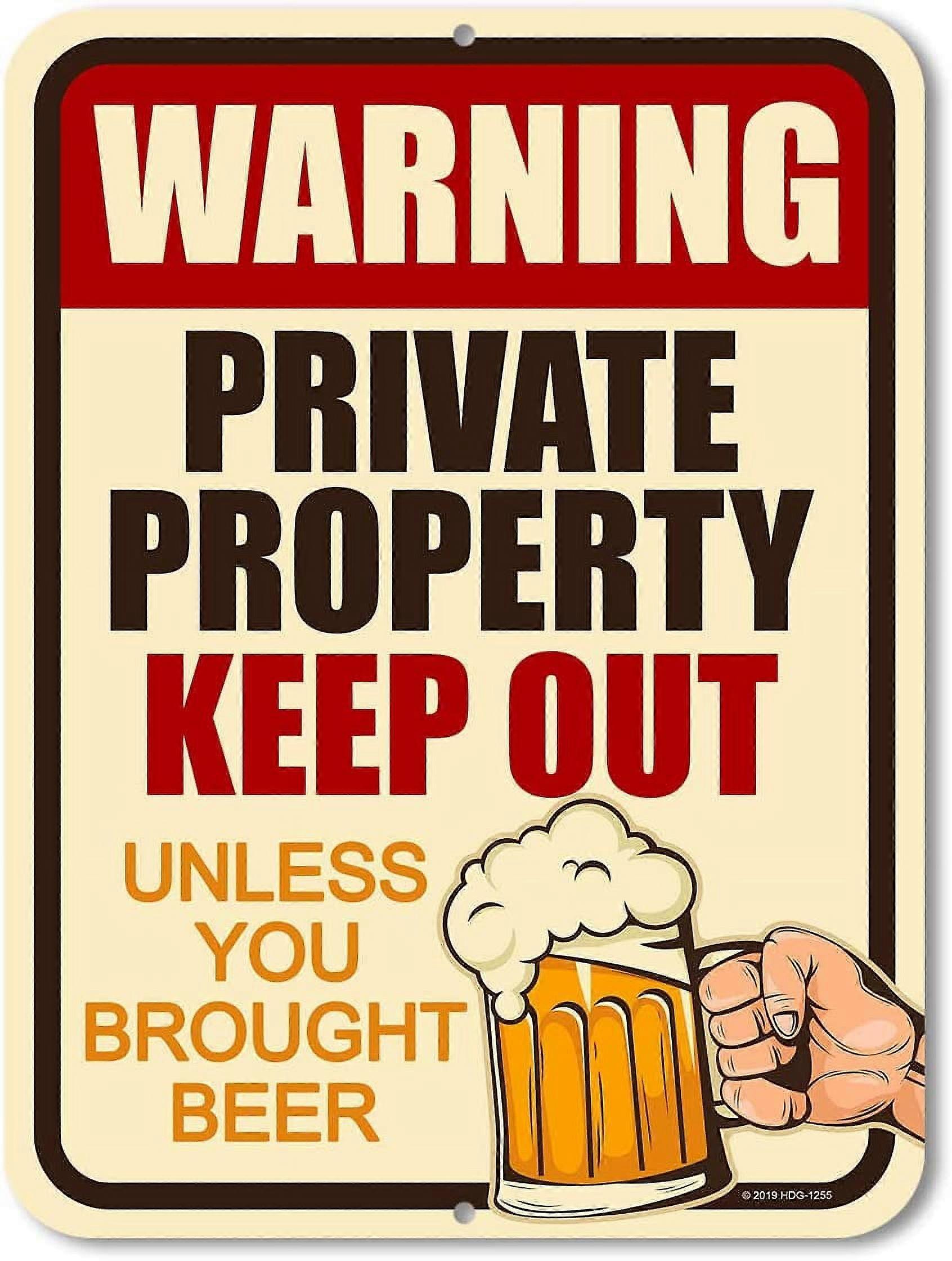 No Trespassing Sign, Warning Private Property Keep Out Unless You Brought Beer 12x9 inch Metal Sign, Funny Sign, Made in USA