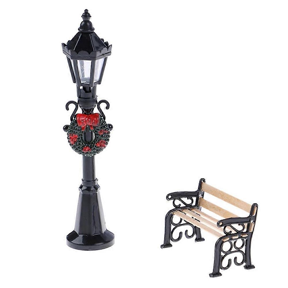 2Pcs 1/12 Dollhouse Miniature Christmas Park Street Lamp & Bench Doll Garden Decor Garden Furniture