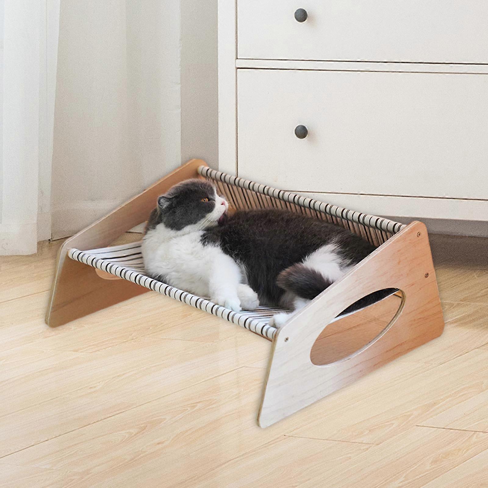 Cat Hammock Bed for Indoor Cats & Small Dogs, Portable Wooden Elevated Pet Furniture, Stripe Design for Kitten Rest & Play