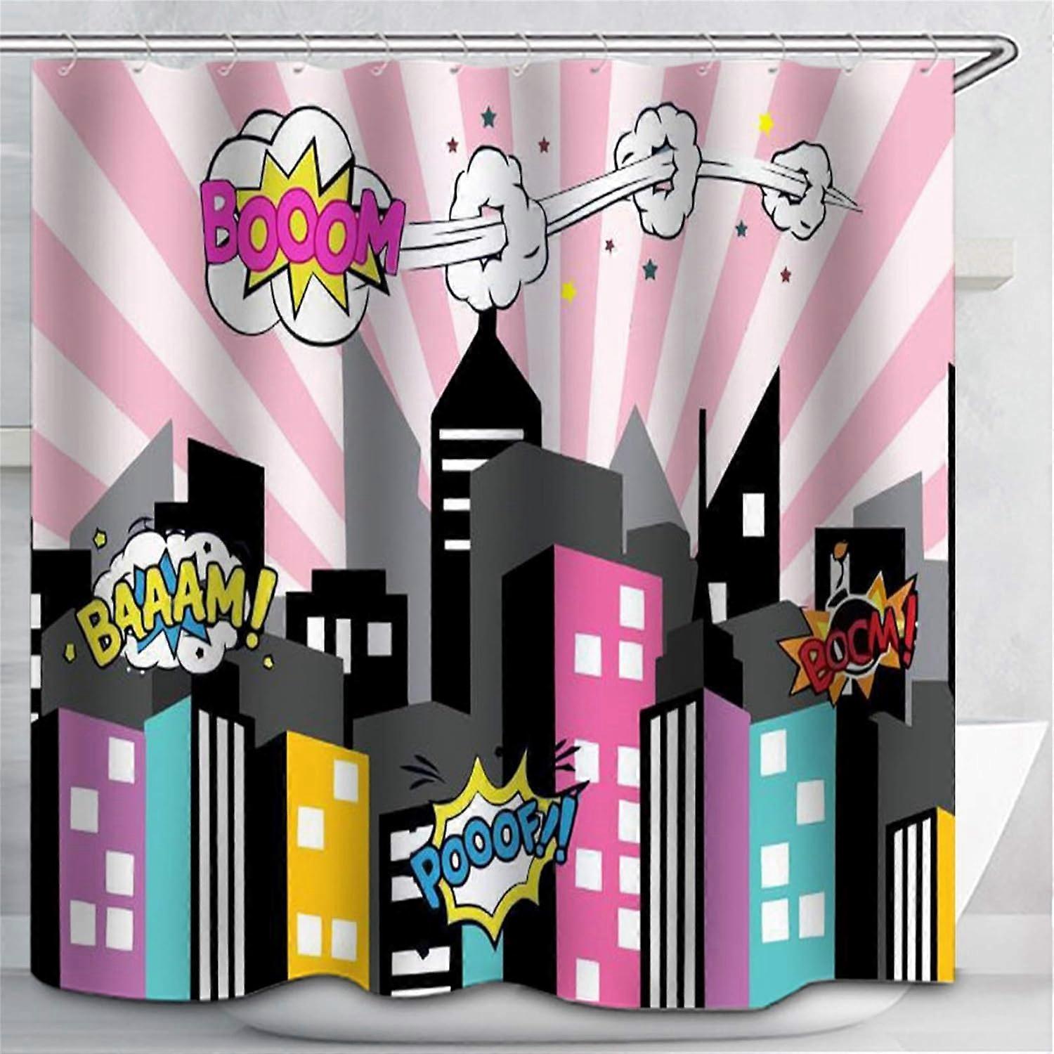 Superhero City Shower Curtain for Girls,Bomb Explosion Superhero Theme Pink Sky Children Bathroom Design Waterproof 12 Hooks 60x72 inches