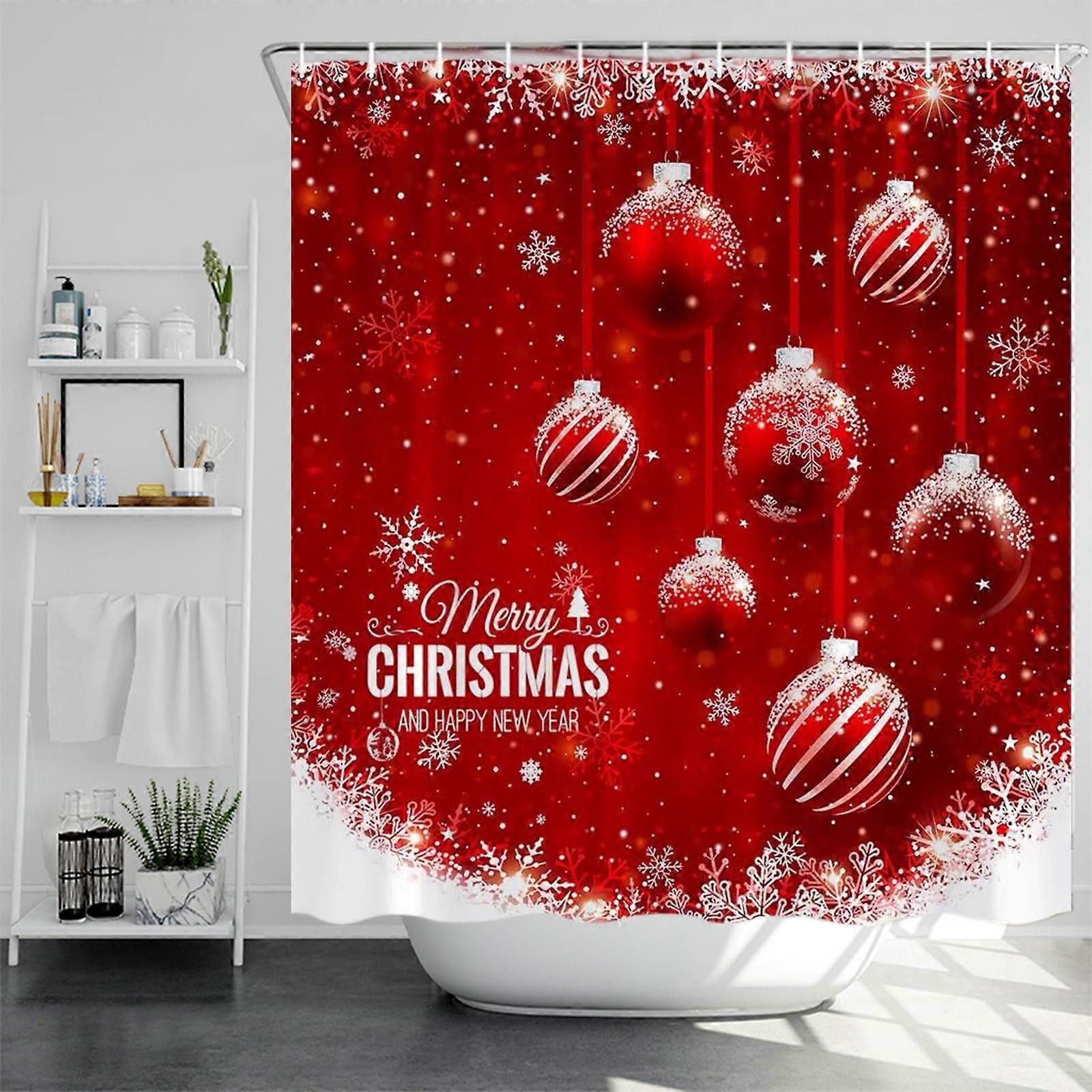 JingChun 1Pc Christmas Shower Curtain Red Balls White Snowflake Happy New Year Merry Xmas Print Fabric Bathroom Curtain with Hook 35*70in