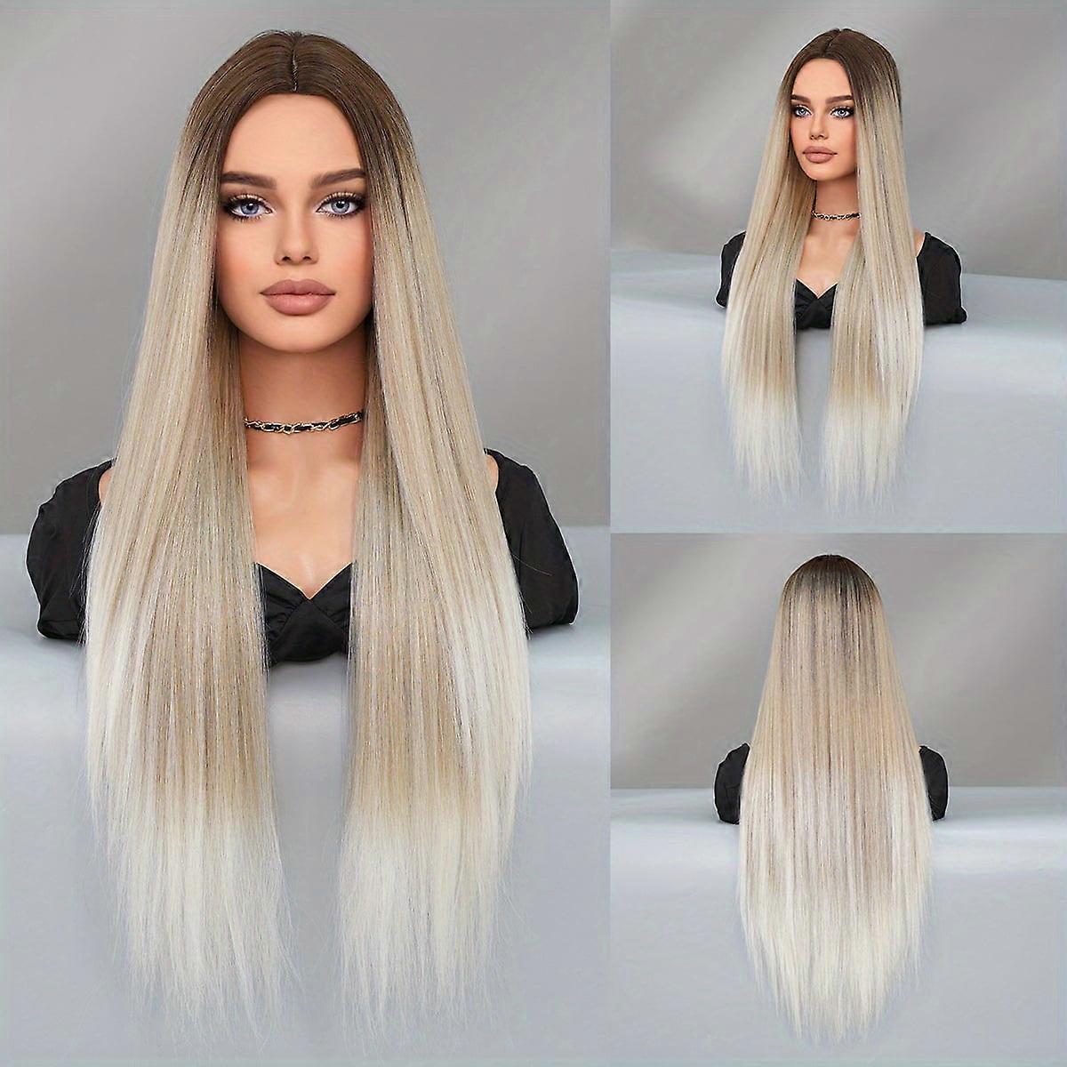1 piece of women's ultra long, medium split straight hair full head cover with natural gold gradually changing fiber wig for outdoor dates