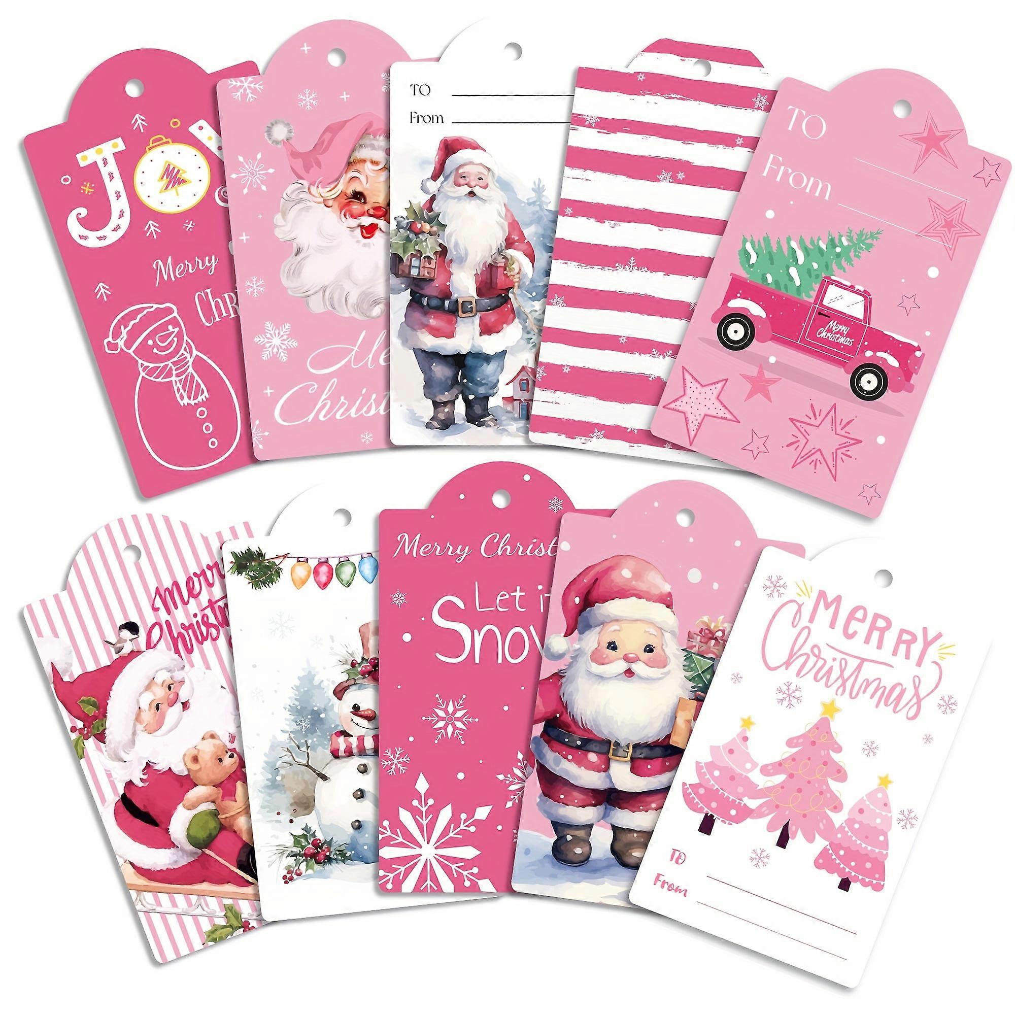 60-Pack Christmas Greeting Card Tags with Pink Cartoon Snowmen & Santa, 118.1" Twine Included - Compatible with All Gifts