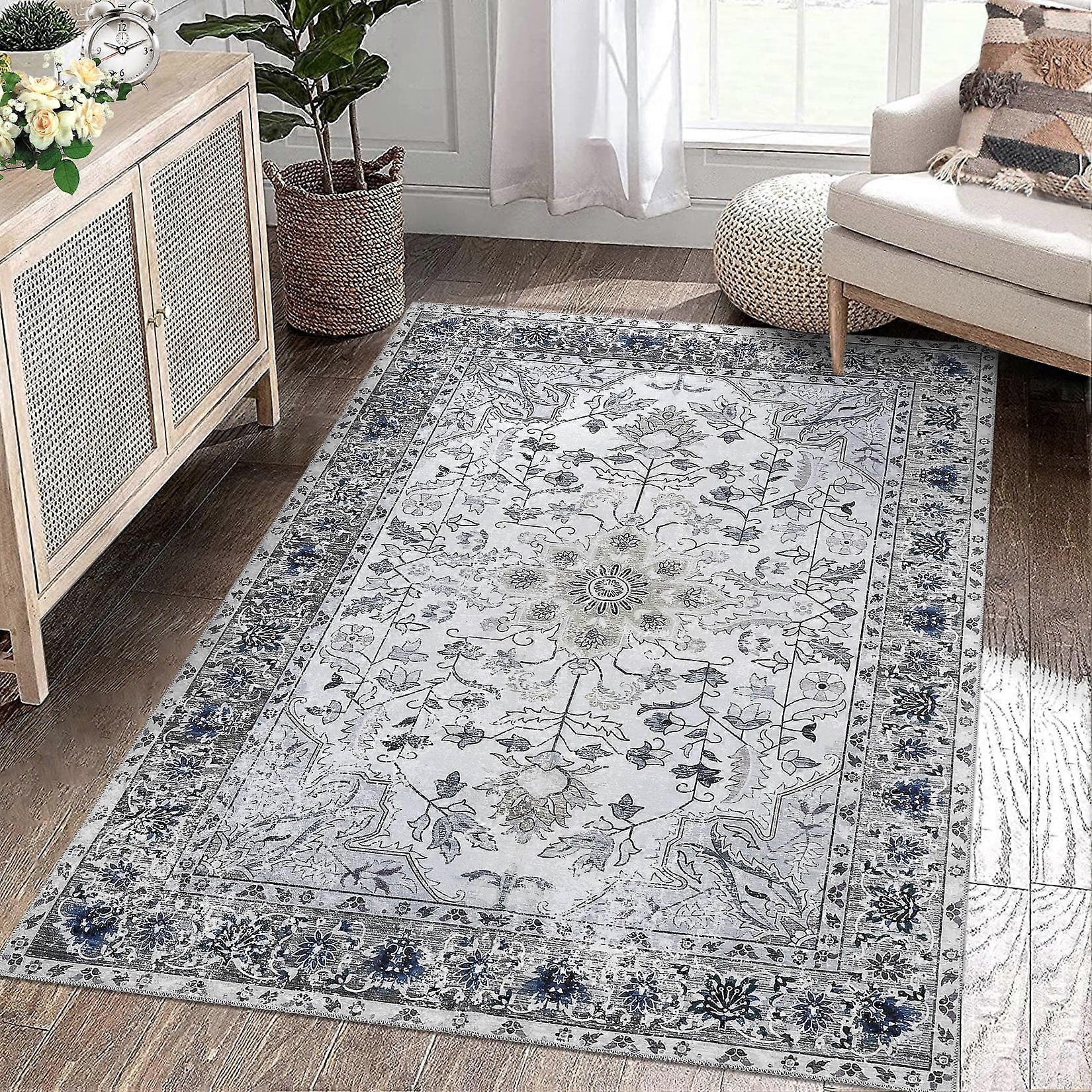 Haperlare Area Rug Vintage Boho Distressed Rug 4 x 6 Oriental Floral Print Area Rug Chenille Foldable Thin Floor Cover Non-Slip Washable Rug, Gray
