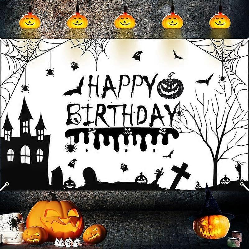 Halloween Birthday Banner, Black & White Pumpkin Spider Theme Night Castle Backdrop, 71x44Inches - Compatible with Halloween Party Decor