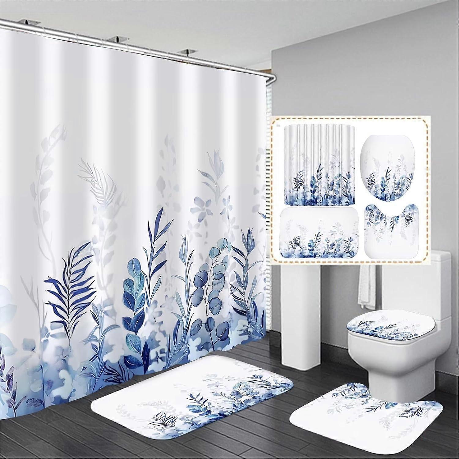 4Pcs Rustic Floral Shower Curtain Set with Non-Slip Rugs, Toilet Cover & Bath Mat, Watercolor Farmhouse Design + 12 Hooks