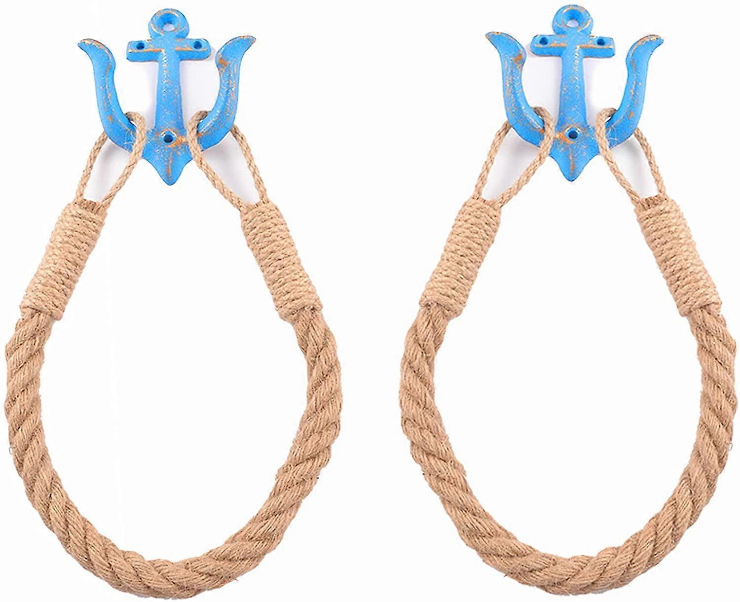 2 Pcs Nautical Anchor Towel Holder with Hemp Rope, Wall Mounted for Towels, TP or Curtains – Blue Anchor Hook (A)