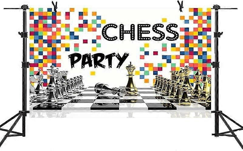 Black and White Checkerboard Chess Party Backdrop with Gold Silver Pieces, 7x5ft Compatible with Photo Booth Studio Props Cake Table Banner BJYYME679