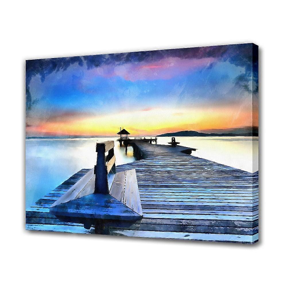 Framed Canvas Print: Sunset Beach Bridge, Modern Wall Art, 8x12 inch (20x30cm), Living Room Bedroom Decor Poster Painting