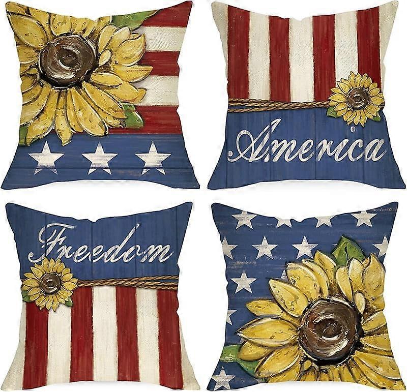 4th of July Sunflower Patriotic Pillow Covers 18x18 Set of 4, USA Freedom Star Stripes Cushion Case, compatible with American Farmhouse Decor