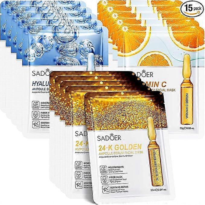 15PCS Vitamin C Hyaluronic Acid Face Mask, Anti-Wrinkle Real Deep Hydration, 24K Golden Moisturiser Overnight Sheet Masks, Natural Soothing Face Mask