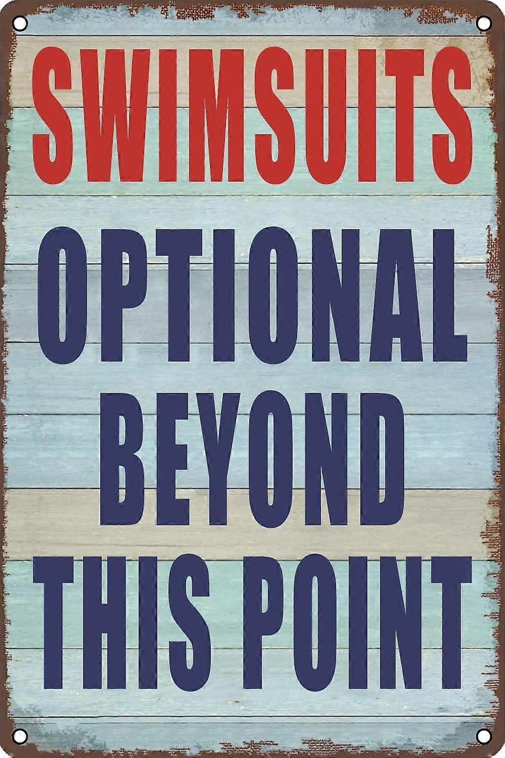 Funny Pool Sign: Swimsuits Optional Beyond This Point - Vintage Metal Tin Wall Decor, 12x8 inch, for Outdoor, Bathroom, Garden, Man Cave