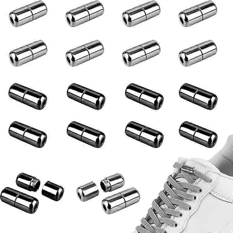 [High Quality] Made of durable metal, these high-quality lace locks prevent the ends of your laces from becoming dull. These no-tie lace locks are durable and feature a matte oxidation process that resists fading. Their smooth surface and edges won't damage shoes. [Quantity, Color & Size] You will receive 16 lace locks in two colors: black and silver, 8 pieces of each. Dimensions: 18 x 8 mm, hole diameter: 3 mm. [Easy to Use] Our elastic laces. Simply thread the laces and tighten the screws. Tie a knot and tighten the screws for optimal comfort. No more tying a knot. Remember to choose the right length; Once cut, the length is fixed. [Unique Shoe Lock System] The metal capsule shoelace locks are suitable for children, people with arthritis or other disabilities, making lacing easier. [Versatile Use] Compatible with most shoelaces, as well as down jackets, sweaters, casual pants, and quilted clothing. They can also be used as clasps for bracelets, necklaces, etc.