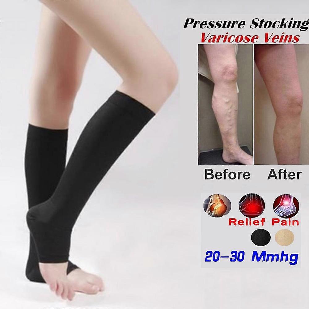 Product Description KEEP HEALTHY: Our knee high compression socks give the support for the legs, enhance blood circulation effectively, and reduce swelling without any tight. Good compression for pregnancy varicose veins to keeps your leg healthy. Keep good compression doing works, relieve muscle fatigue, and soreness after long time exercise. OPEN-TOE DESIGN: Open-toe compression socks will perfect fitting on your leg and feet, have more flexibility and adjustable space and it is easy to put on and put off. Without any scratch and irritation during you use the socks. You will don't have any uncomfortable feelings even put on the day in and day out. BREATHABLE & SUITABLE COMPRESSION: Use nylon and spandex material, make the compression socks have better elasticity & durable, keep comfort, and breathable at the same time. Moisture-wicking properties rapidly and quick-drying keep your legs comfortable and dry all day. MORE SIZE CHOICE: Open-toe knee-high compression socks for men and women, Suitable for all occasions,you can refer to the chart to choose the suitable size. Our compression socks have nice and snuggly supportive without being too tight or painfully uncomfortable, enhance blood circulation effectively. HIGH-YIELD INVESTMENT: Buying a pair of socks with a limited price will bring you unlimited health benefits. Suitable for people with varicose veins, long time working, nurse, running, cycling, office workers, airplane travelers, athletes, fitness workouts. MEDICAL INDICATIONS: Protection of veins during traveling or sporting. Chronic venous insufficiency. Lower limb varicose veins. Varicose veins during pregnancy. Rehabilitation. Product details Color: Beige, Black Size: S/M, L/XL Package Include: 1 Pair Socks Note: Due to the screen difference, the color may be a little different from what you expect, please allow it Dense structure of the product excellently supports the varicose veins. Flat seams secure comfort when worn. The heel zone is strengthened additionally that extends the service life of the products. Compression level of the product is set in strict compliance with medical requirements.