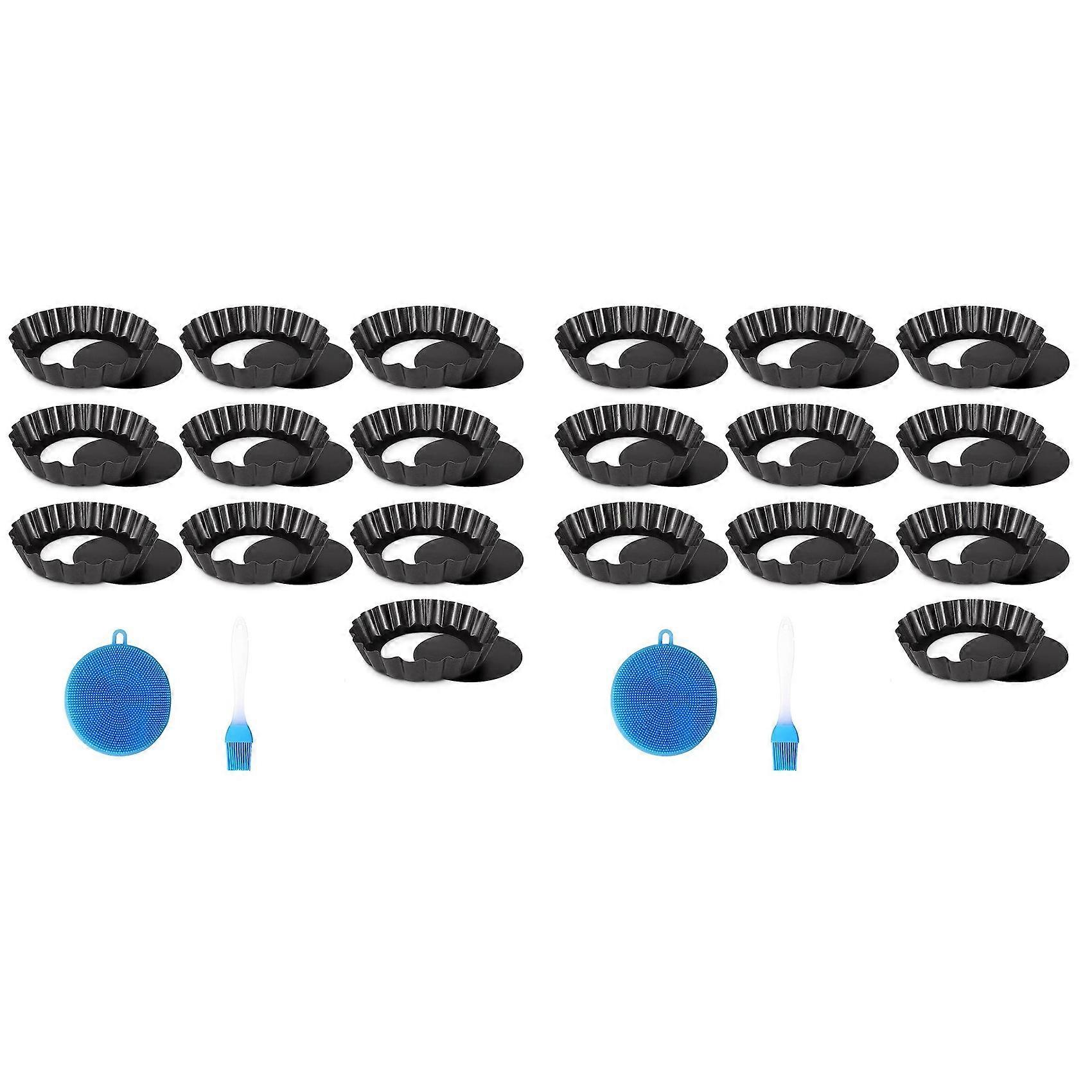 Exceptional Quality: If you are looking for an investment-worthy pan that is durable & rust-resistant, then our heavy-duty tart pan made of scratch-free carbon steel is the best. It will maintain its shape even at a temperature from -105 to 600°F No More Spilling: Tired of messy leakage ruining your baking experience? Our advanced technology-fitted tart pans with removable bottoms help you bake quiche like a pro without fear. Take your baking game to the next level with our leak-proof pans Extend Your Products Life: The tart molds for baking are easy to clean in the dishwasher, but washing them by hand in soapy water is best to extend their life. Do not use steel wool or abrasive cleaners on the surface, as they will damage the coating [DURABLE & RELIABLE DESIGN]: The fluted sides of the tart pan increase the surface area, which in turn creates a strong crust capable of holding and containing the heavy ingredients of a quiche or a fruit tart. Non-stick coating and detachable base provides easy release and clean-up. [perfect HOME & KITCHEN ACCESSORY]: tart pie pan is perfect for creating creamy pumpkin pie, pineapple pie, apple pie, muffins, cupcakes, brownies, pizza and other delicious desserts. Make your baking process fun and let everyone expect the party to come! Color: Black Gray Material: Carbon steel Package Contents: 20 x Tart Pan 2 x silicone brush 2 x silicone pad