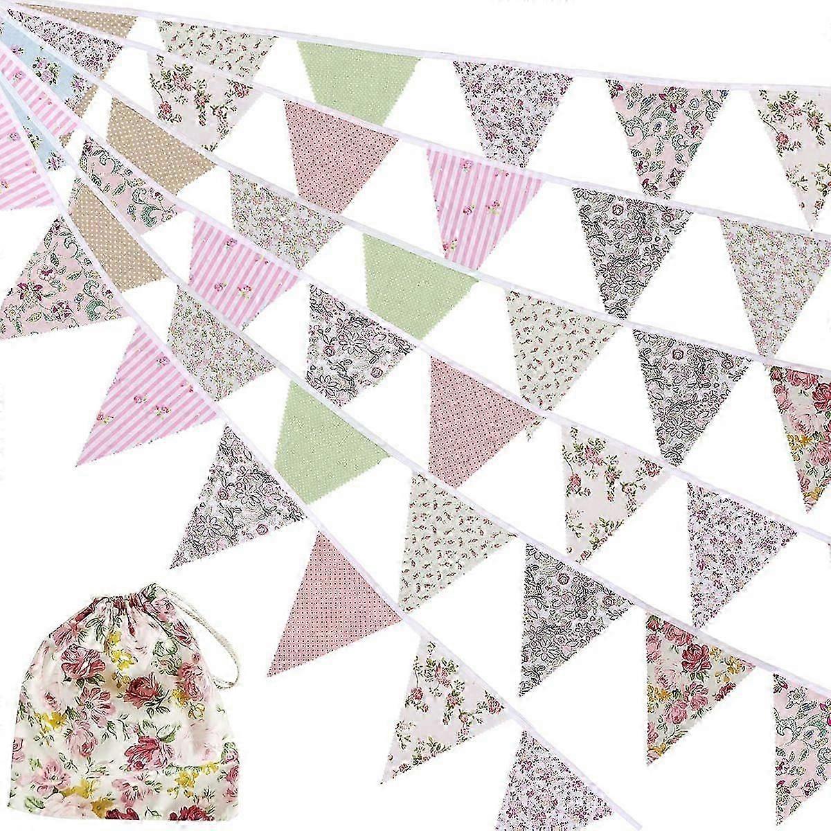 High quality materialmade of soft cotton fabric, comfortable and skin-friendly, can be used multiple times without fading, sturdy and durable.Various patternsThe banner is equipped with drawstring pockets for easy storage and carrying Reasonable sizeThe length of banners is 12 meters (40 ft) in total and the size (bevel edge x base) of each one is 17.5 x14cm(6.9x5.5inches).The distance from one banner to its next one is 7 - 9 cm and both sides have cotton ropes to tie up, which is convenient for you to decorate scenes with them.Wide ApplicationsWith the unique design of different flowers, dots and stripes,our Fabric Bunting Banner could add colors to various occasionssuch as restaurants, parties, celebrations, baby showers, weddings, birthdays, gardening, outdoor activities, tea parties, bedrooms, etc.