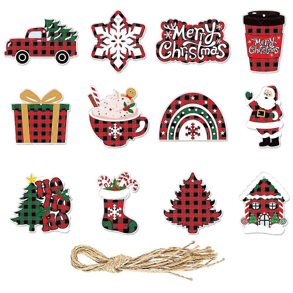 Christmas party decoration pendants red and black plaid pendants Christmas atmosphere decoration props 12 pieces of cards + hemp rope / bag, J-0262